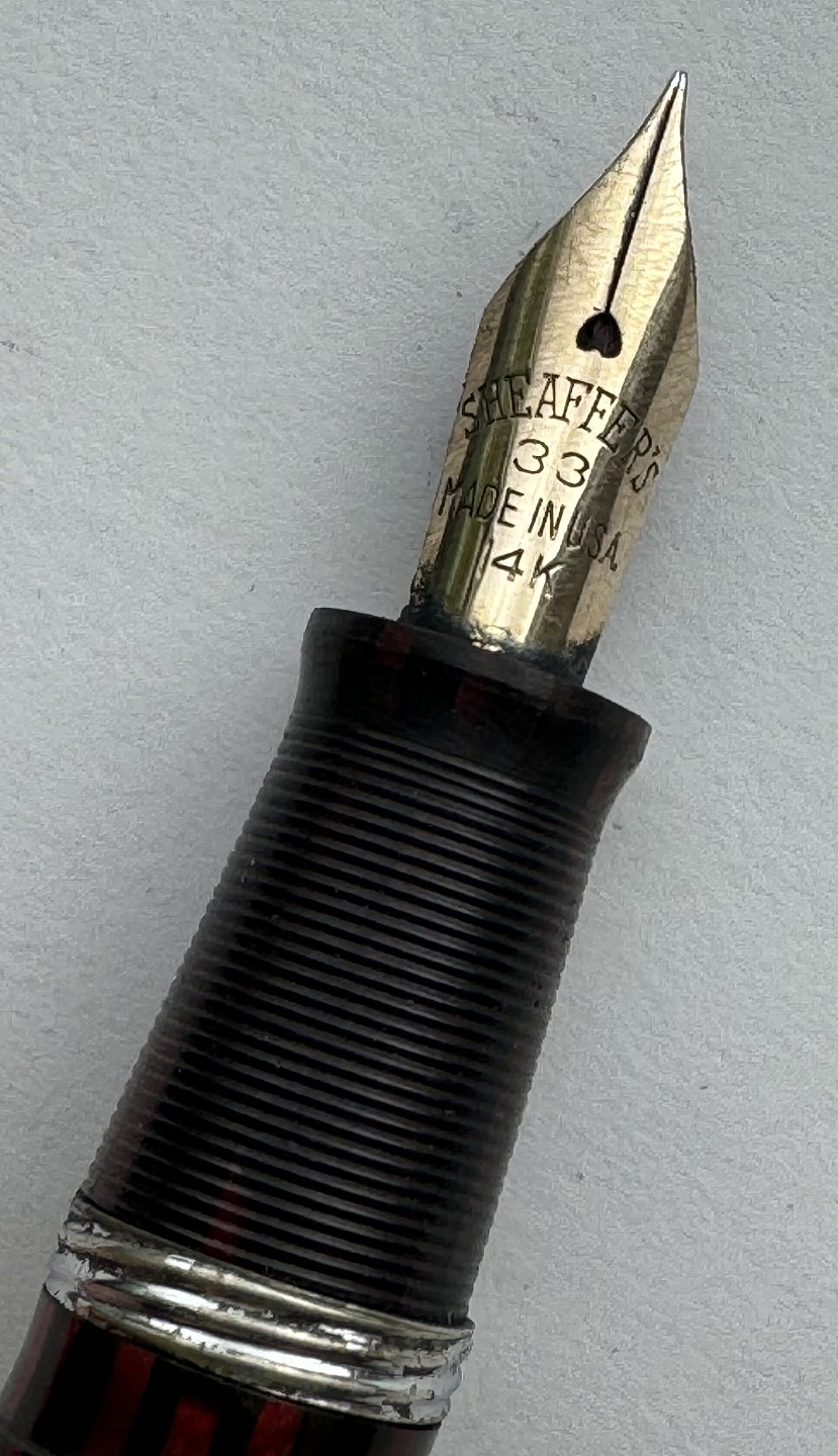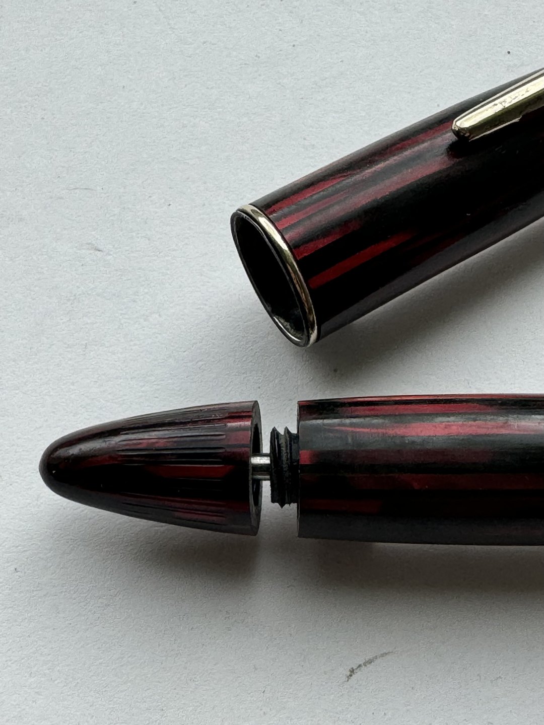 Rød og sort stribet Sheaffer fyldepen fra Sheaffer Pen Co. I U.S.A. Fremstår i god stand med skal repareres før end den igen holder blæk. Ingen skader eller reparationer. Alle dele originale til denne model. Mål: 12,5 cm lang.