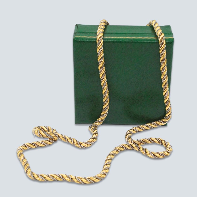 Snoet halskæde af 14 kt. guld og hvidguld, i ekstra lang kvalitet.