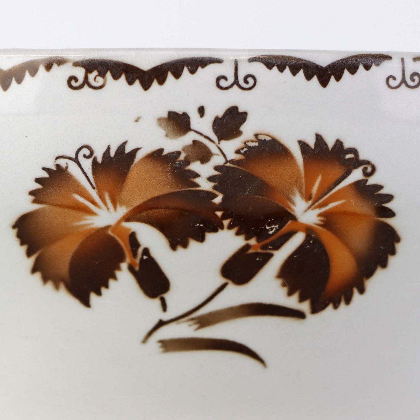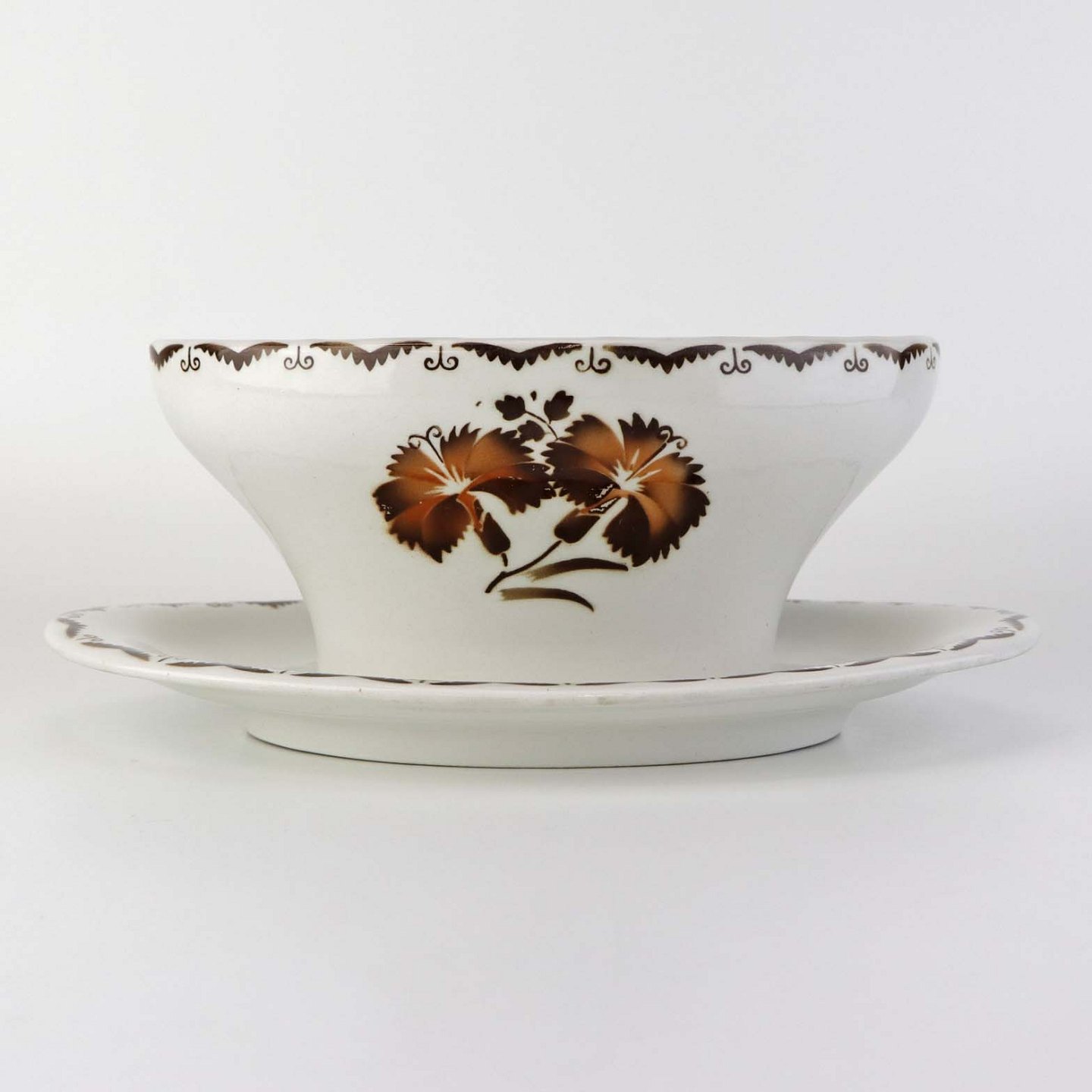 Stel i glat hvid fajance i stelform C med dekoration af brune nelliker og ranker. Stellet blev produceret i perioden år 1930-1941