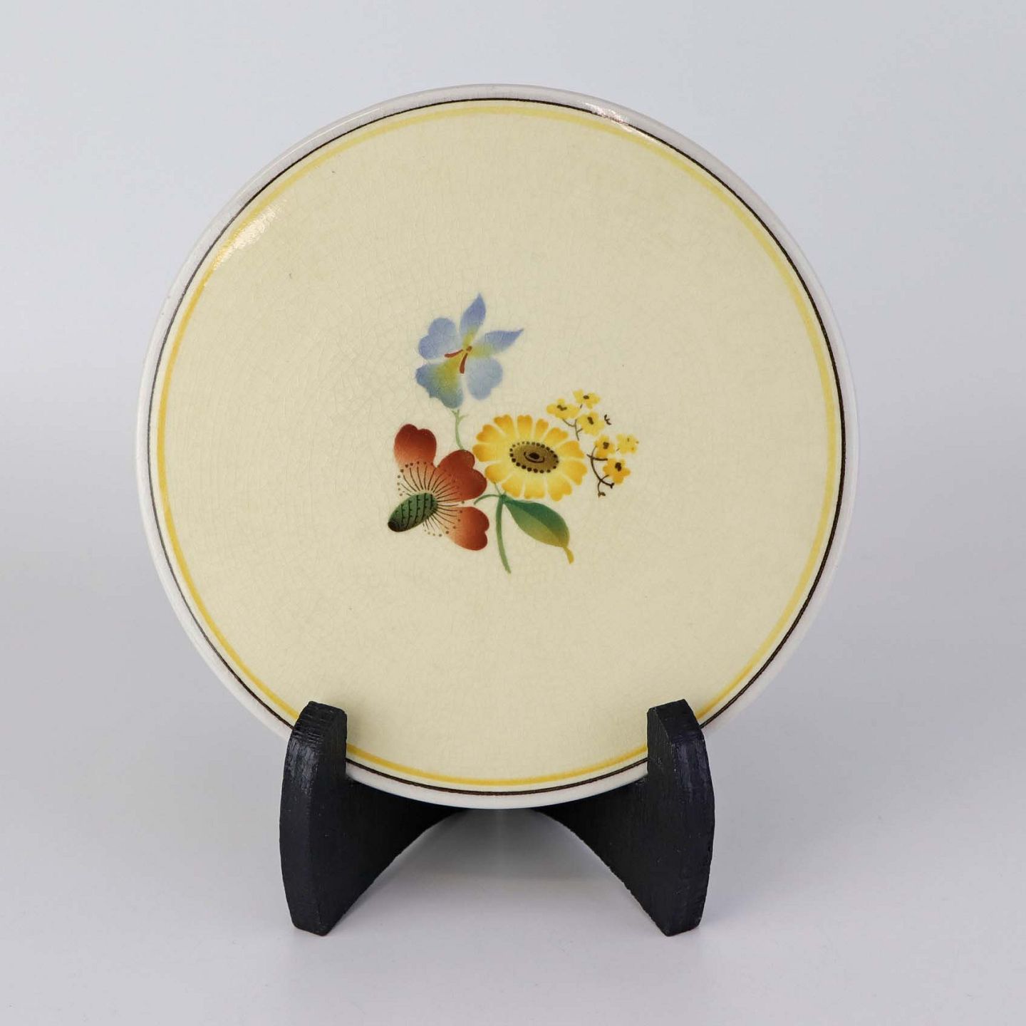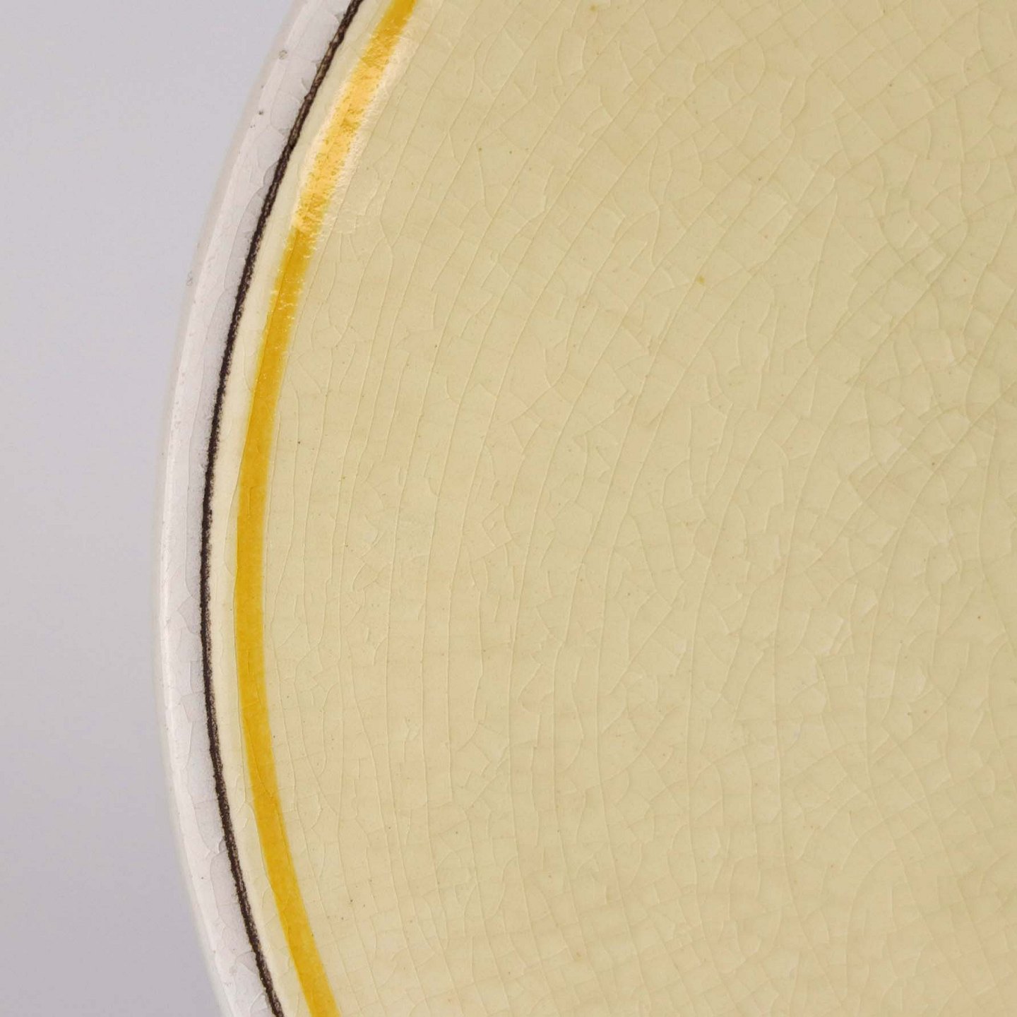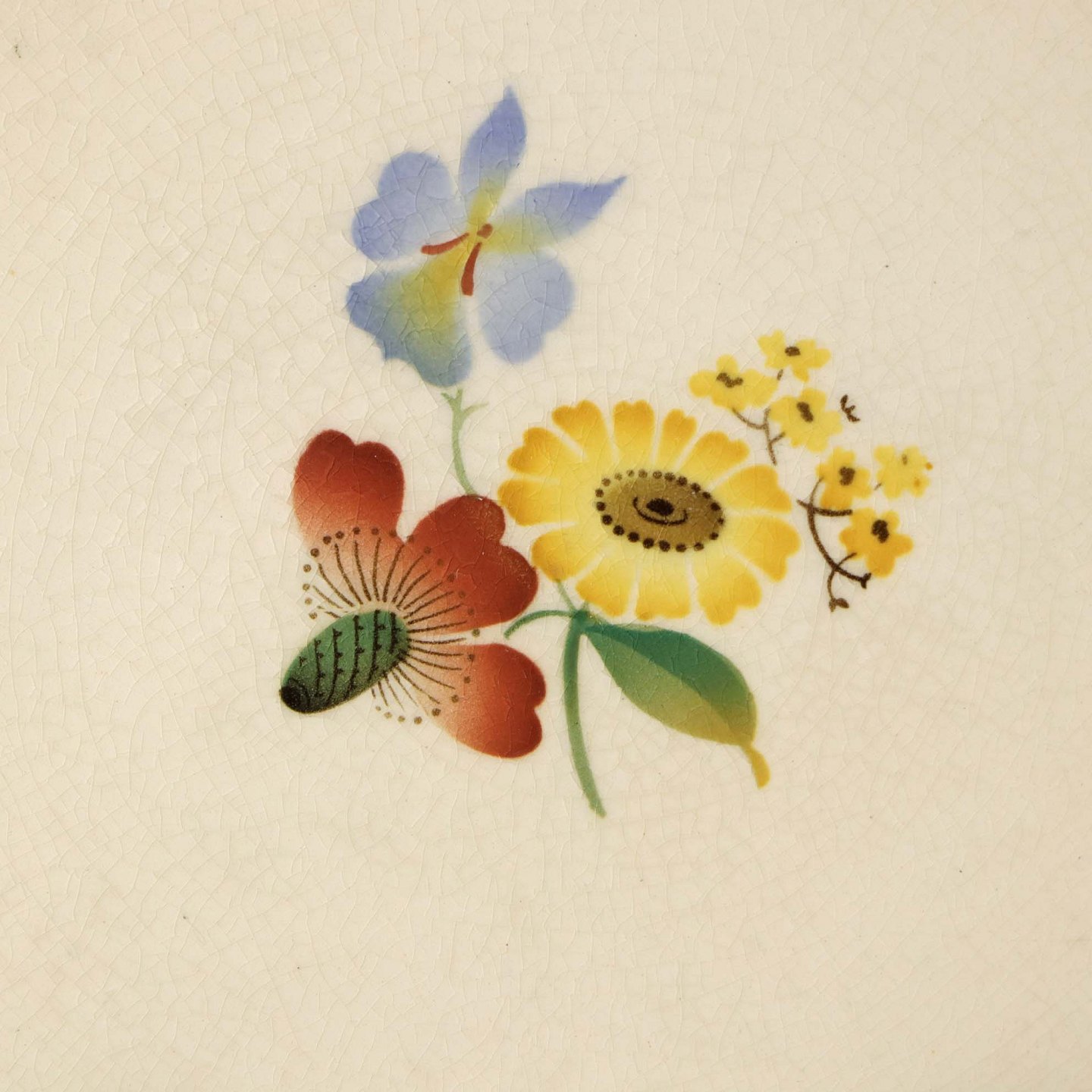 Stel i glat gul fajance med dekoration af farverige og forskelligartede blomster samt med gul og sort kantstreg.