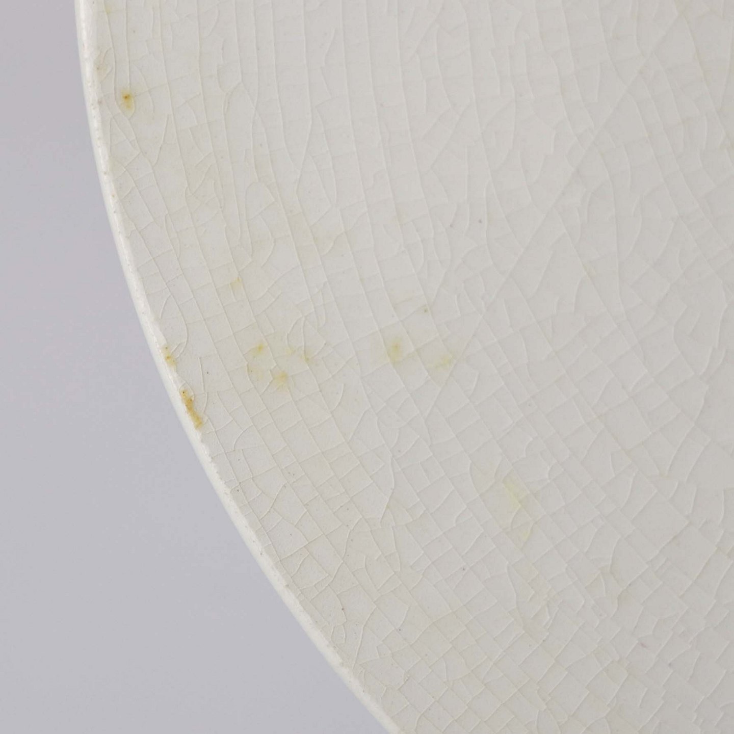 Fremstår med krakkeleringer i glasuren samt mørkning under glasuren på brikkens underside.