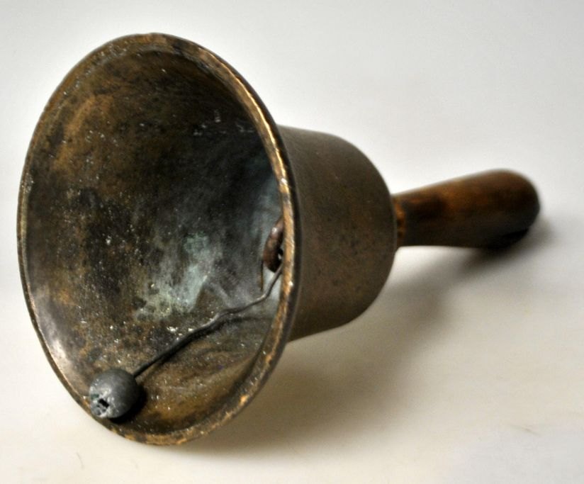 Antik 1700-tals barok bord klokke af malm. Med skæft af drejet træ. H.: 22 cm.