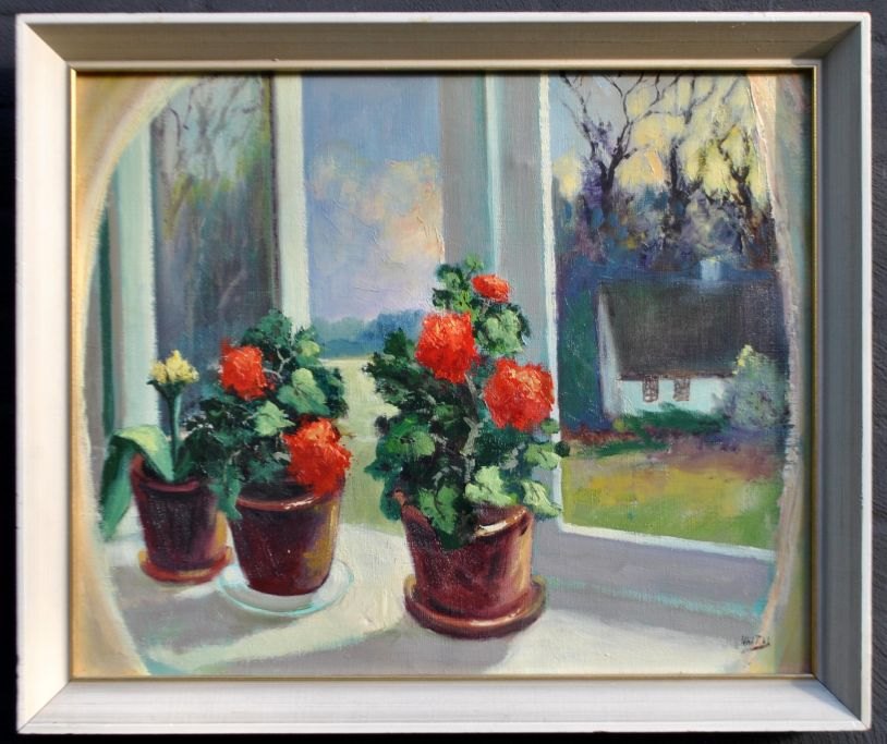 Pihl, Kaj (1894 - 1978) Danmark: Potteplanter i et vindue. Olie på lærred. Signeret. 42 x 52 cm.