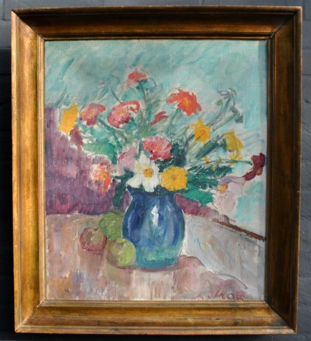 Moe, Andreas Carl (1877 - 1952) Danmark: Vase med blomster på et bord. Olie på lærred. Signeret. 63 x 51 cm.