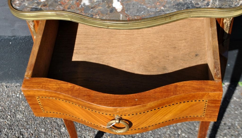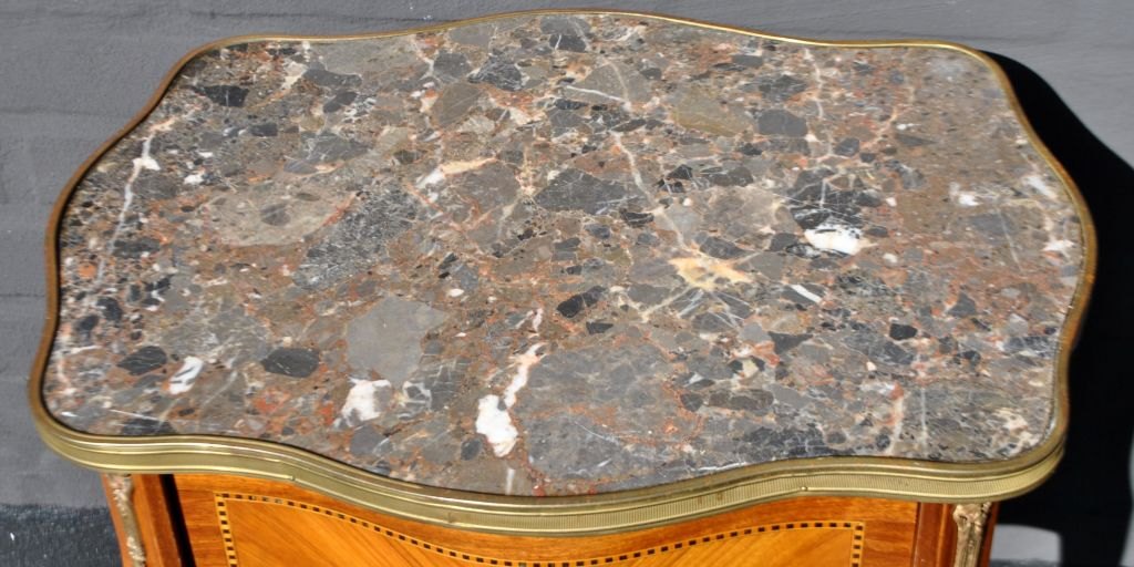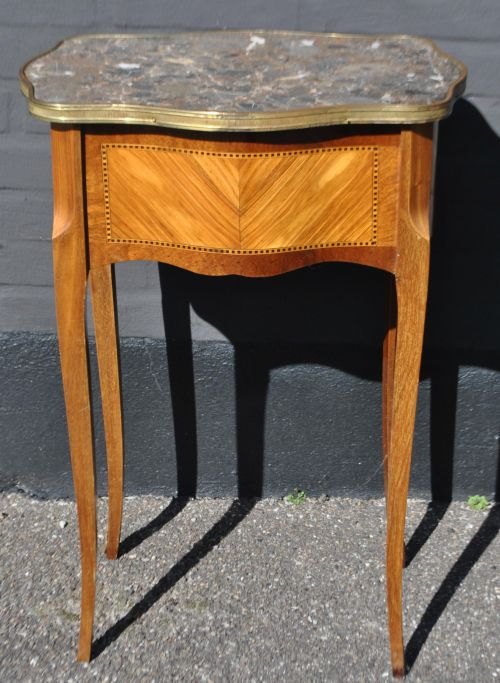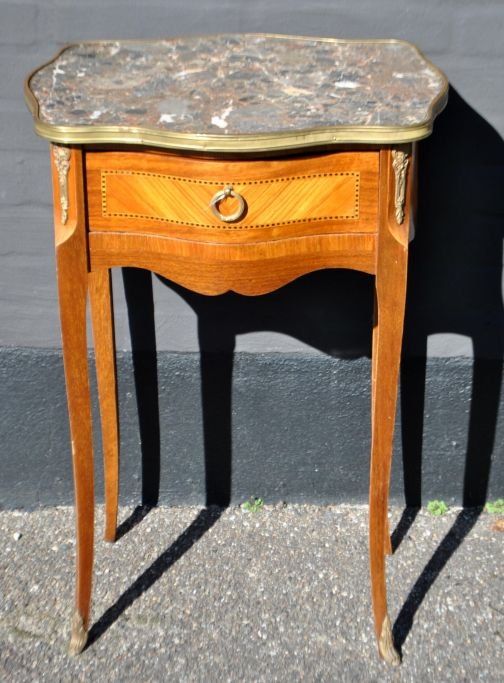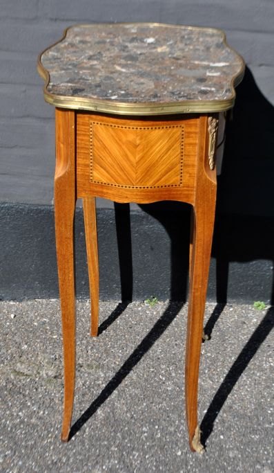 Fransk lampe bord, 20. årh. Med intarsia. Med messing kant og broget marmorplade. Med bronzesko. H,; 69 cm. B.: 47 cm. D.: 36 cm.