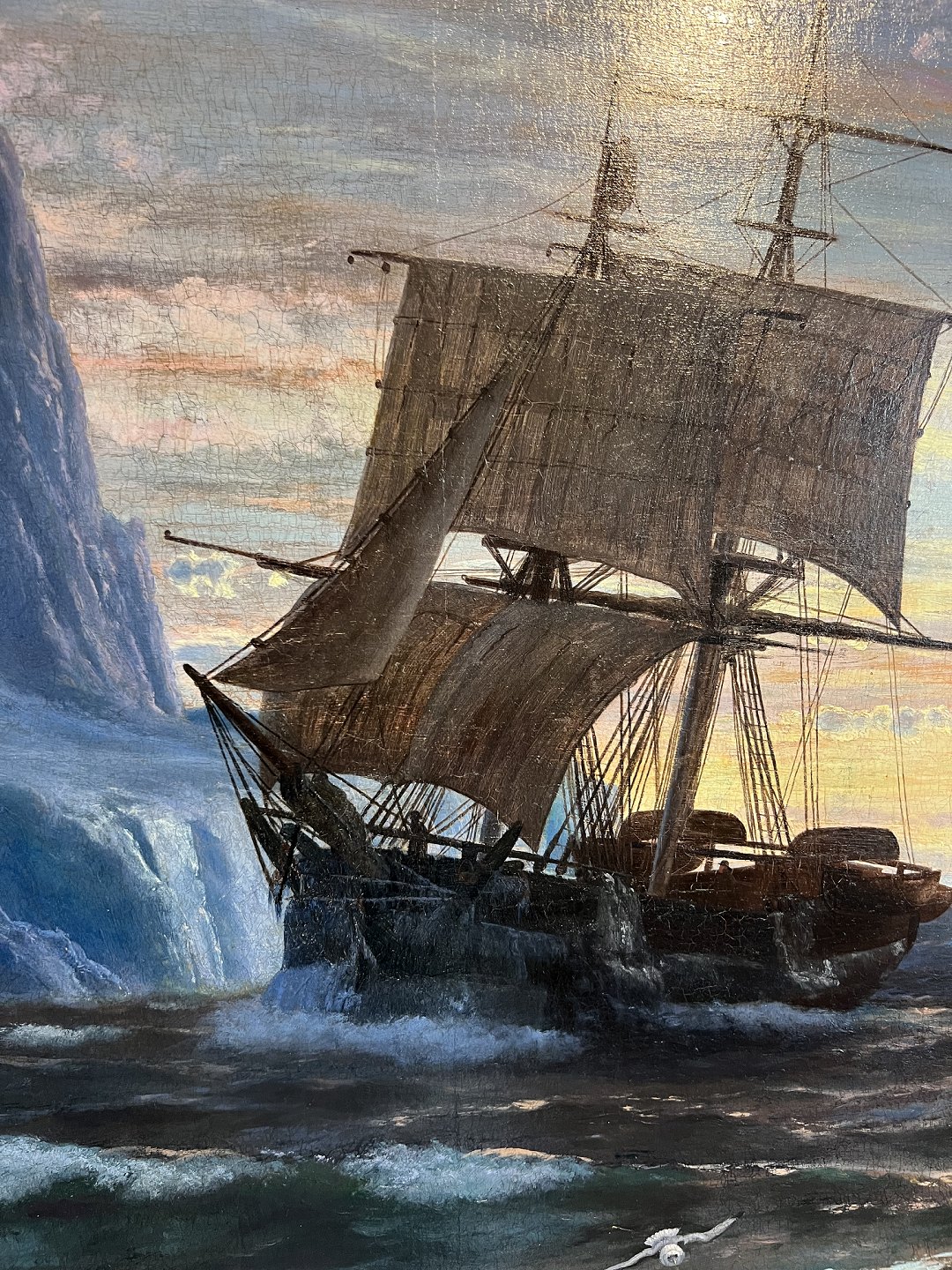 I E C Rasmussen parti fra Grønland med skib, isbjerge og solnedgang. Jens Erik Carl Rasmussen, 1841-93, olie på lærred. Signeret og dateret 1872. Lysmål: 98x156cm. Med ramme: 112x170cm