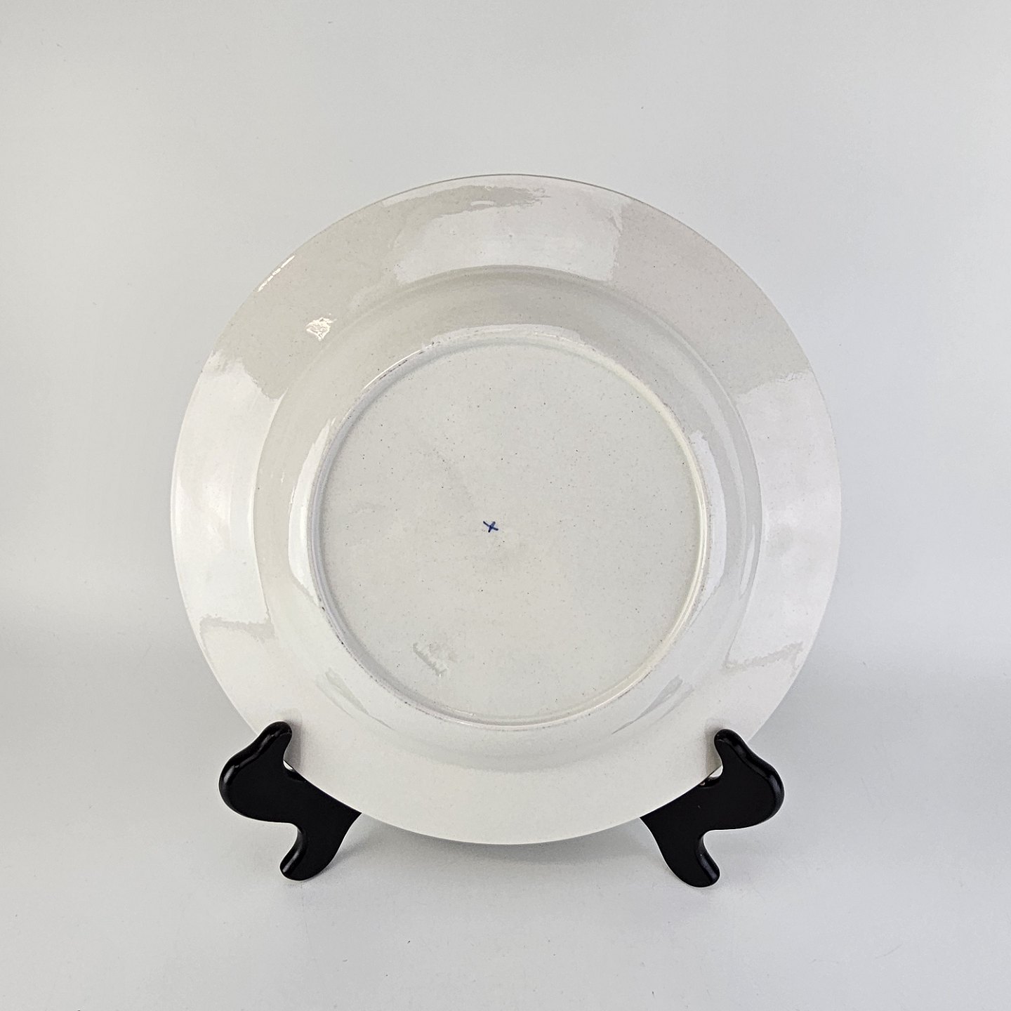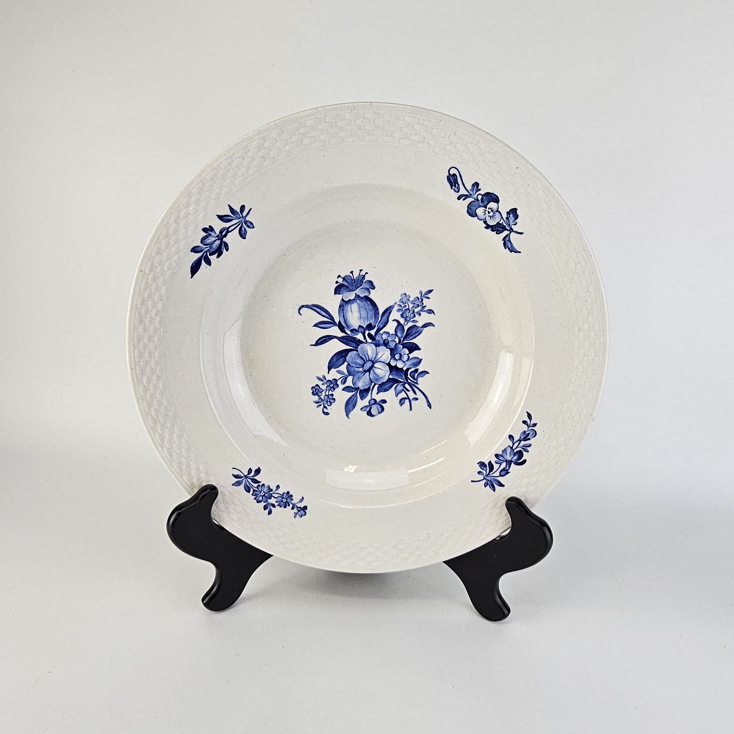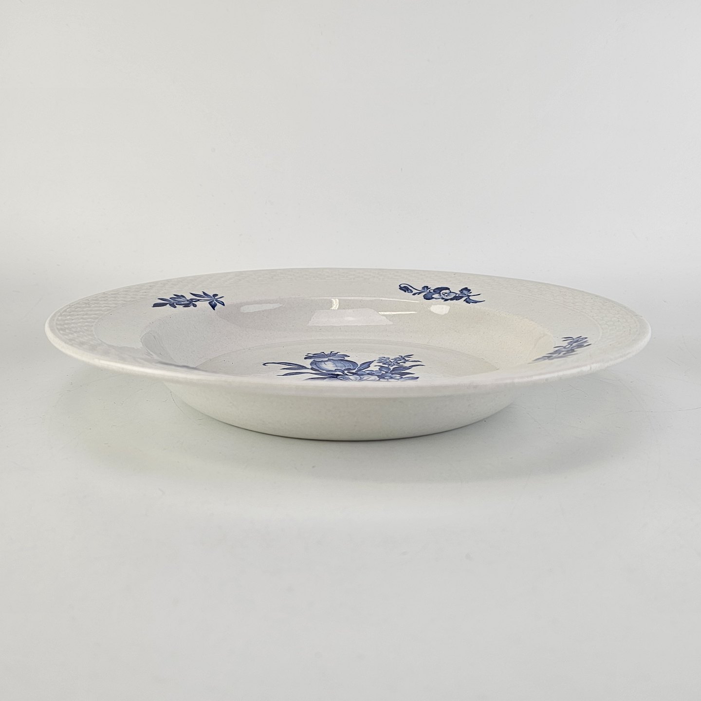 Stel i glat hvid fajance med dekoration af blå blomster og flettet kant