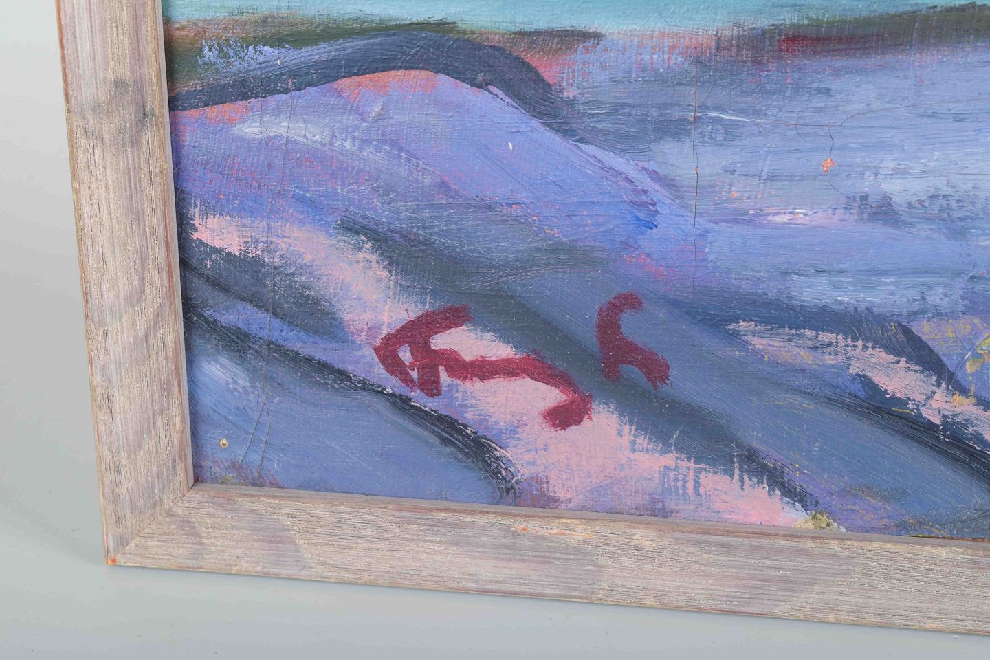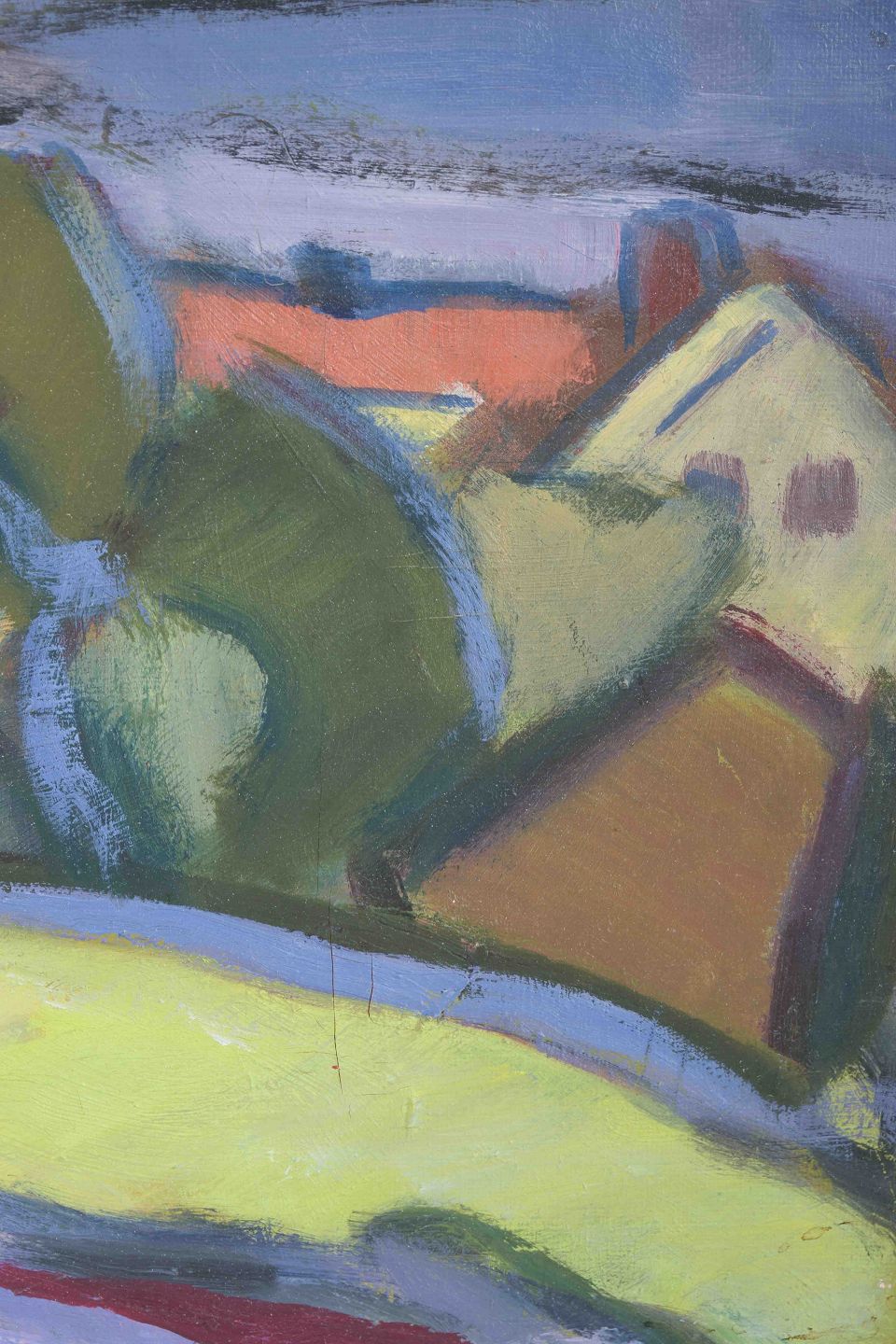 Et ekspressivt landskabsmaleri udført i en farverig og forenklet stil, hvor blå og lilla toner dominerer forgrunden, mens grønne og gule flader antyder marker og bevoksning. Maleriet bærer præg af en kraftfuld penselføring og en næsten abstrakt opbygning, hvor naturens former opløses i rytmiske farvefelter.
