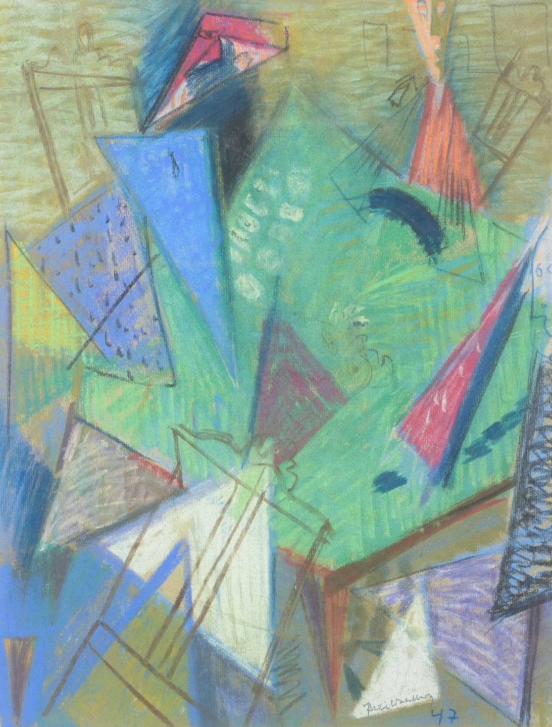 Et ekspressivt, geometrisk-abstrakt værk med et komplekst spil af trekantede og diagonale former, der overlapper hinanden i et rytmisk mønster. Farveflader i blå, grønne, røde og gyldne nuancer danner en vibrerende komposition med tydelige spor af Wahlbergs eksperimenterende tilgang til farve og form.