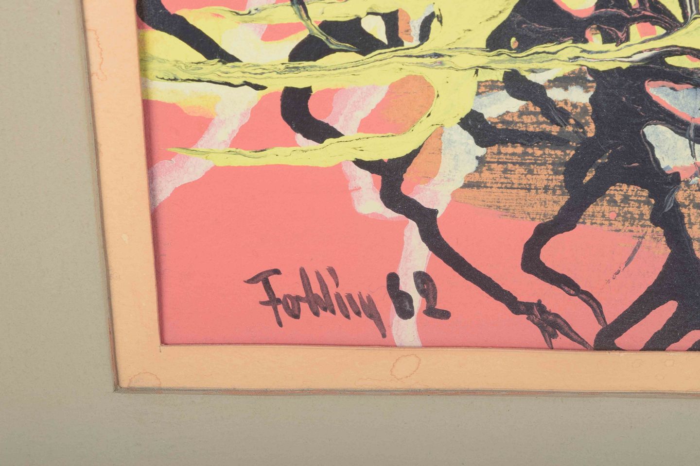 Et ekspressivt og komplekst abstrakt værk, hvor figurative antydninger og organiske former smelter sammen i et netværk af linjer og farvefelter i gule, sorte og rosa nuancer. Maleriet bærer præg af Föhlíns særlige modernistiske formsprog og hans optagethed af farvens og linjens rytmiske spil.