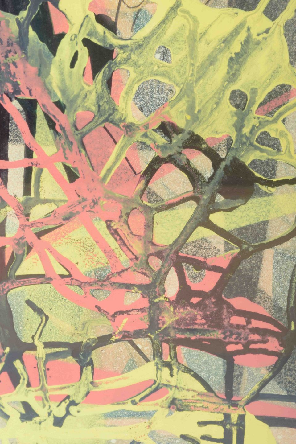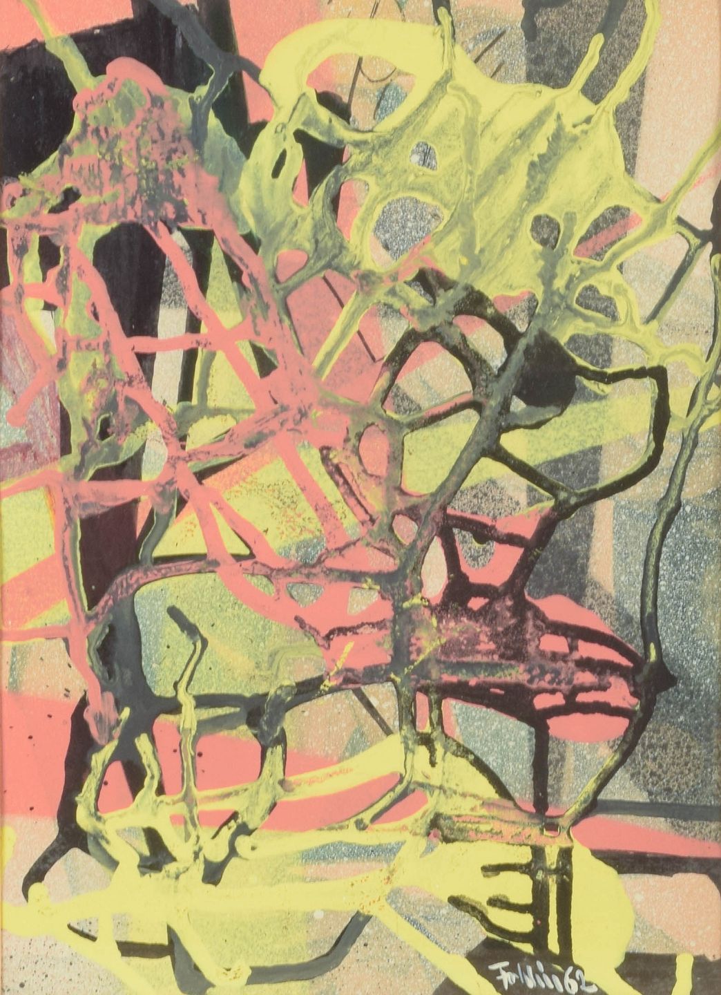 Et dynamisk abstrakt værk udført i gouache, hvor lag af organiske linjer og transparente farver væves sammen til en ekspressiv helhed. Værket demonstrerer Föhlíns karakteristiske sans for rytme, bevægelse og farvespil, som knytter ham til den nordiske modernismes formsprog