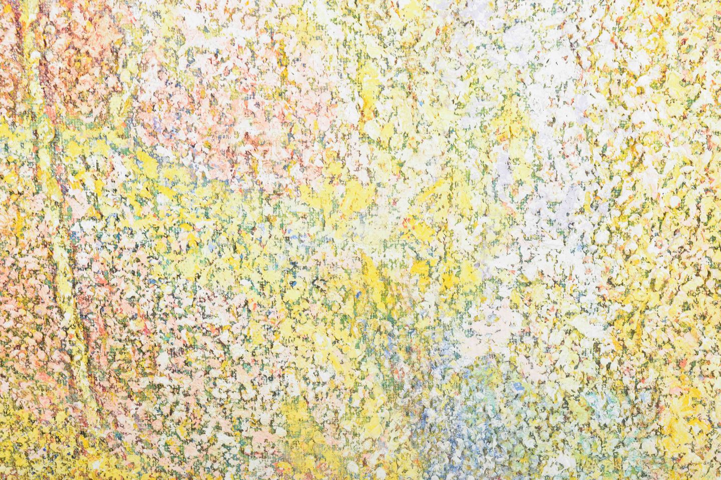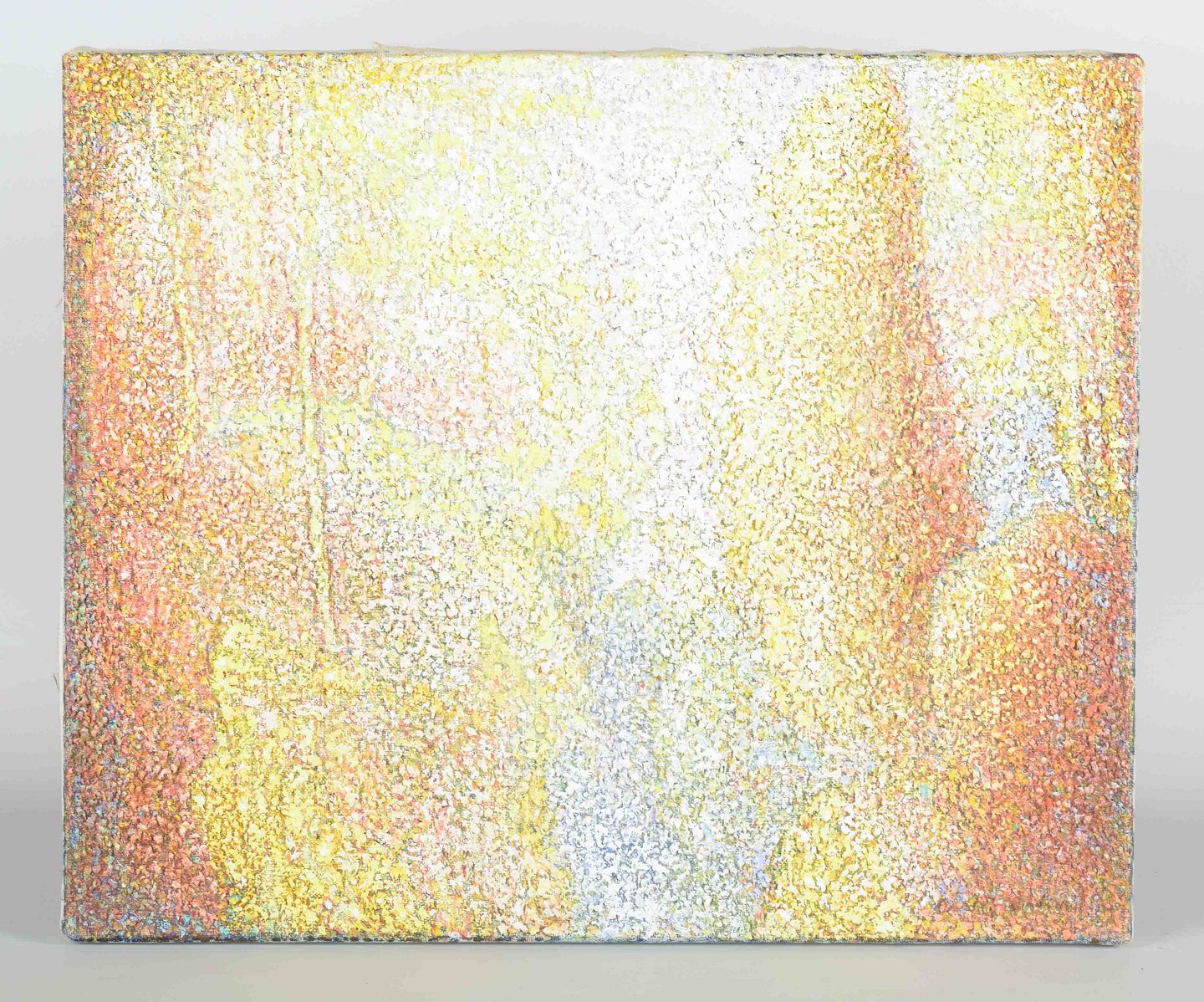 Et lyrisk, koloristisk maleri i pointillistisk præg med varme gyldne, hvide og blå nuancer. Værket har en meditativ karakter og indfanger sommerens lys i et abstrakt formsprog.