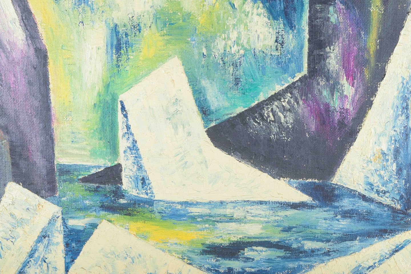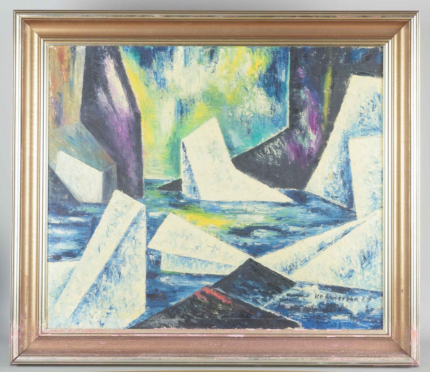 Et ekspressivt maleri af Karl Peter Olsvig Andersen med motiv af isbjerge i Grønland. Udført i kraftige penselstrøg og en stærk koloristisk palet, der indfanger kontrasten mellem isens hvide flader og det blå hav.