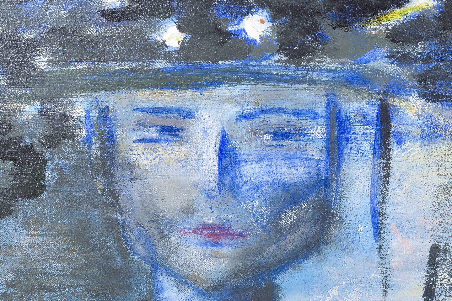 Et ekspressivt maleri med motiv af et kvindeansigt i blå toner, dekoreret med blomsterkrans. Udført ca. 1950’erne-60’erne.