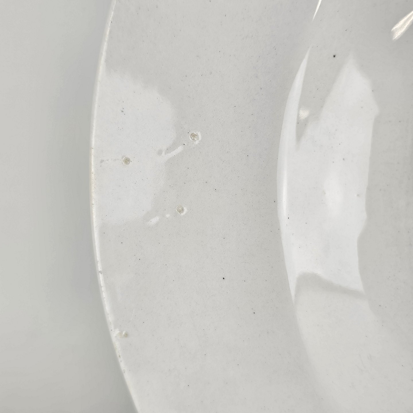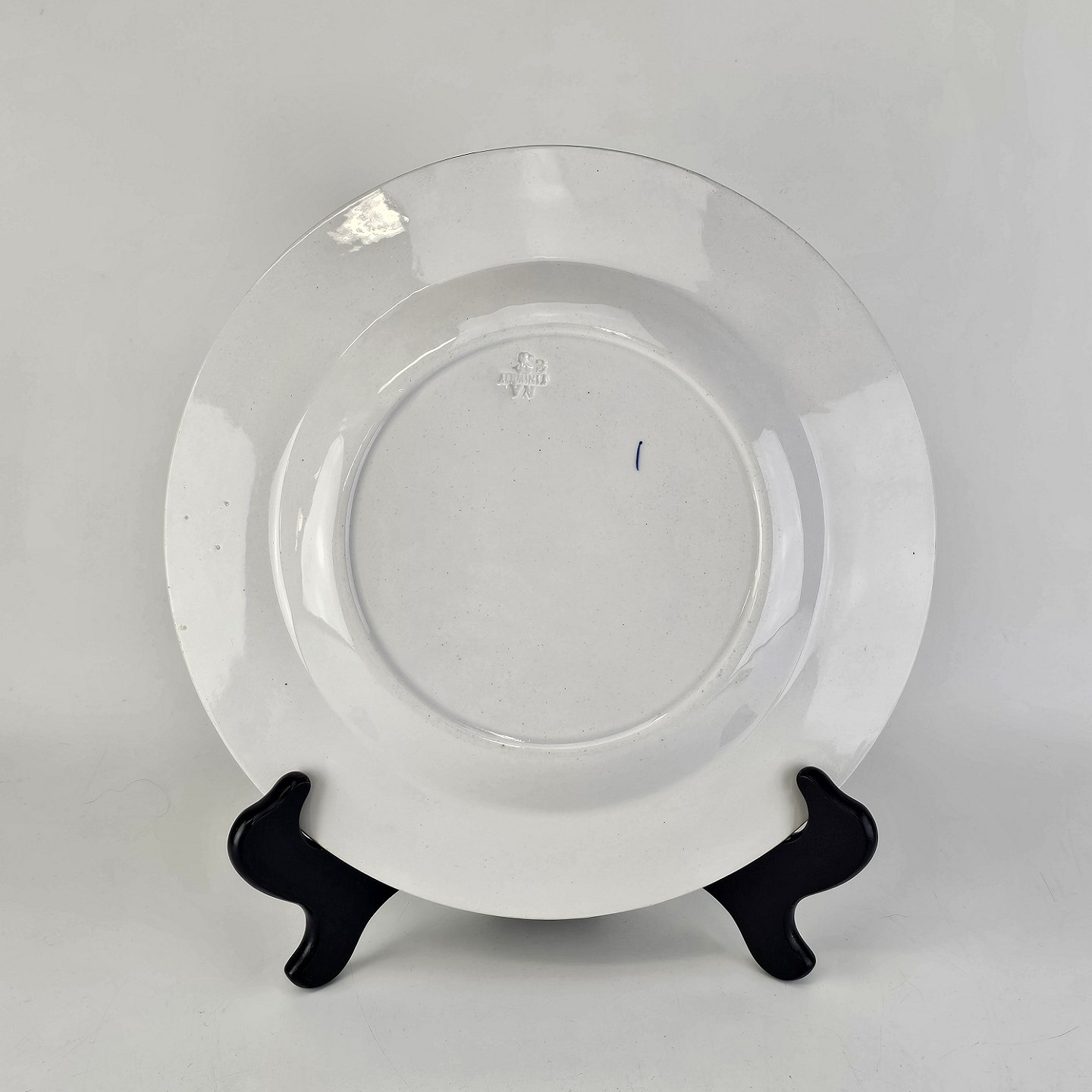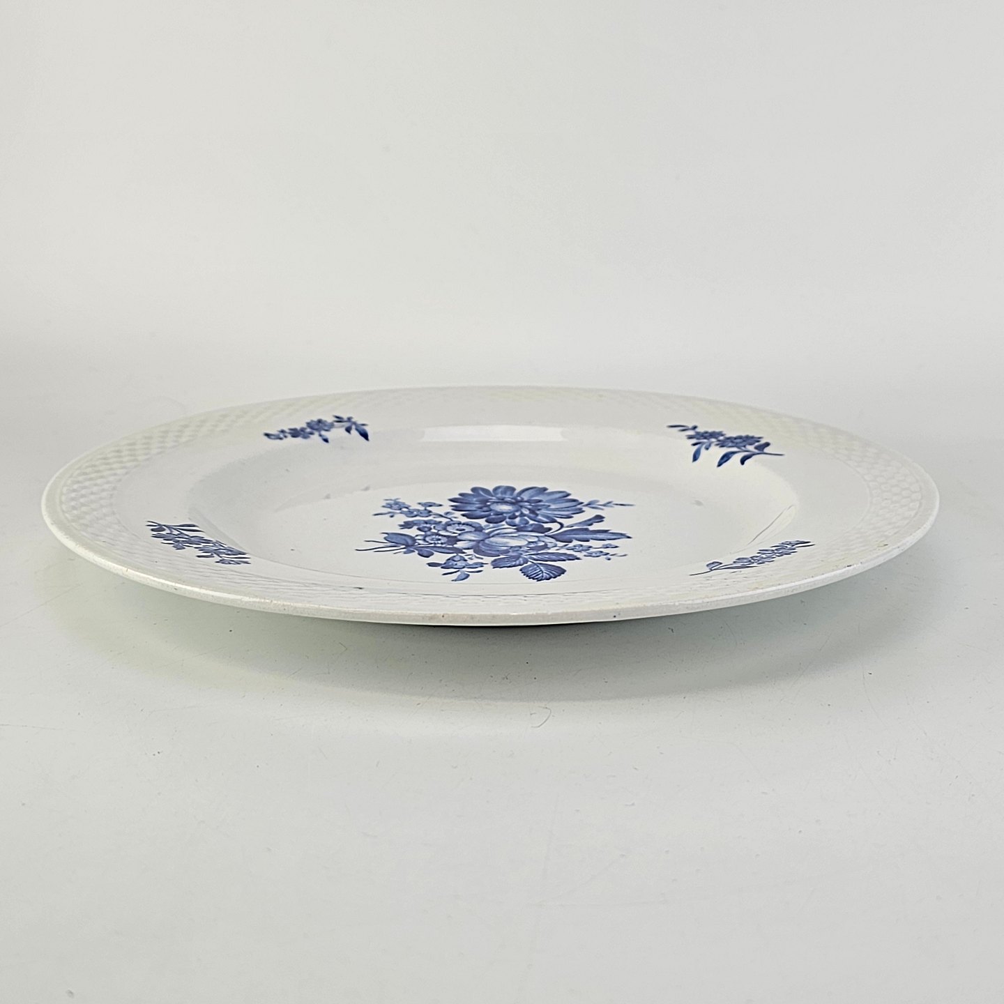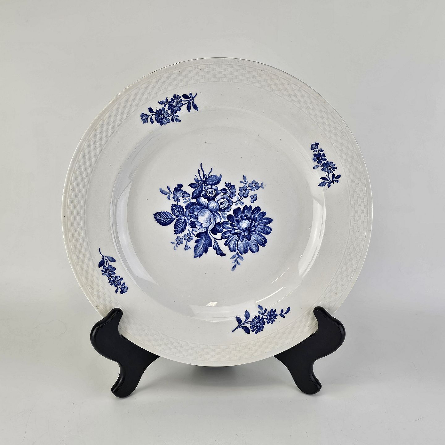 Stel i glat hvid fajance med dekoration af blå blomster og flettet kant