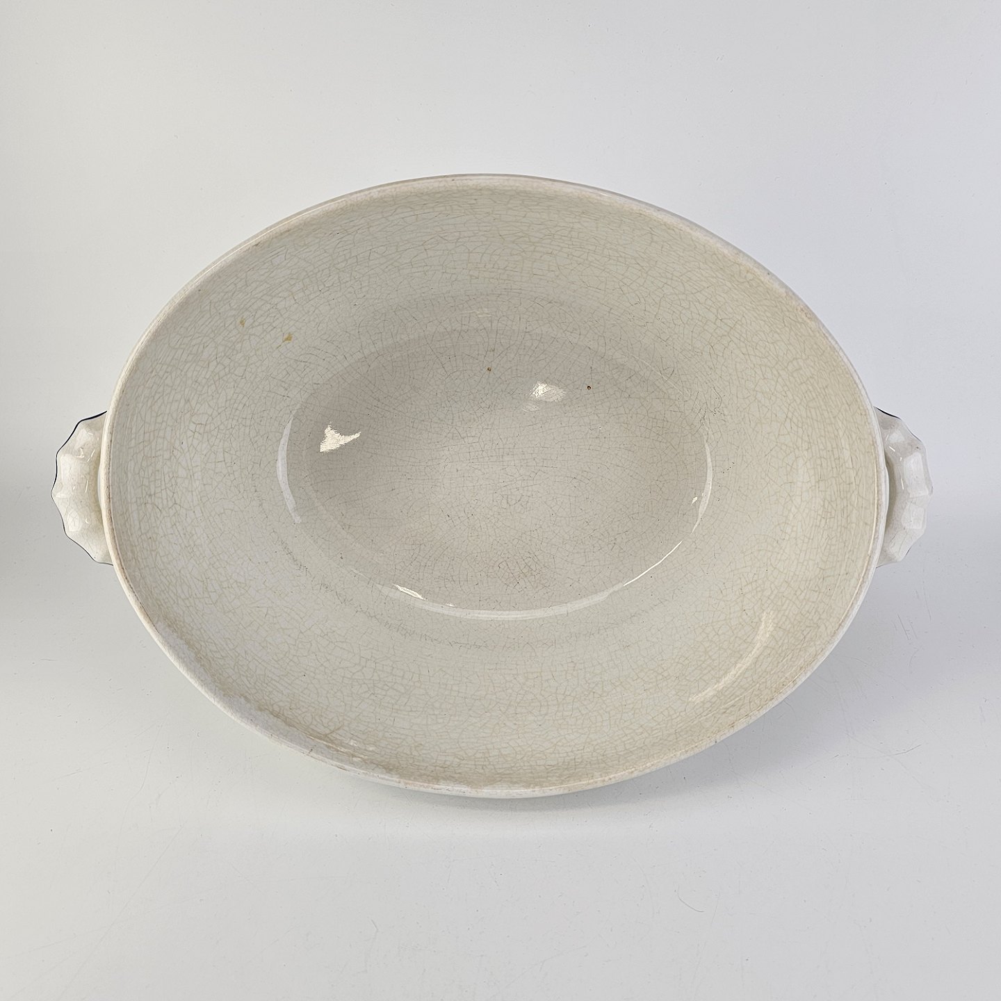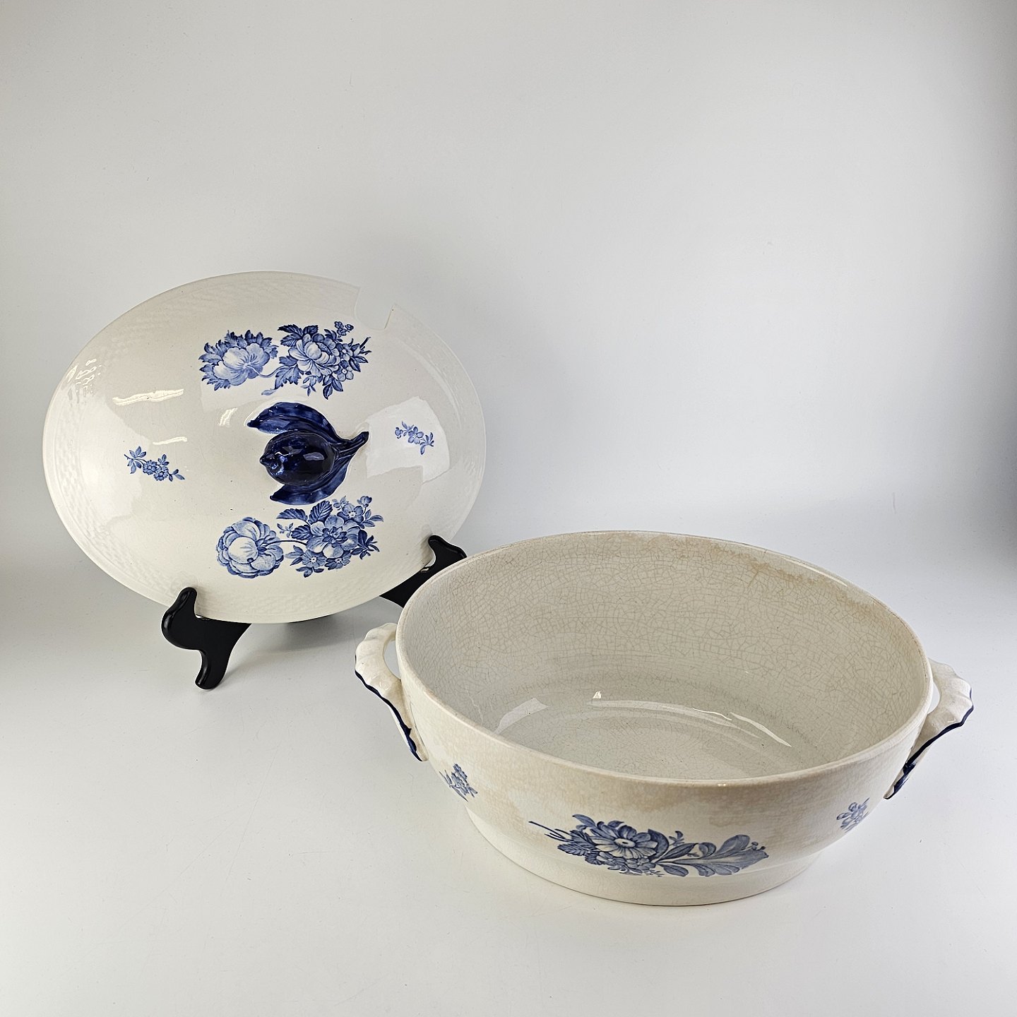 Stel i glat hvid fajance med dekoration af blå blomster og flettet kant