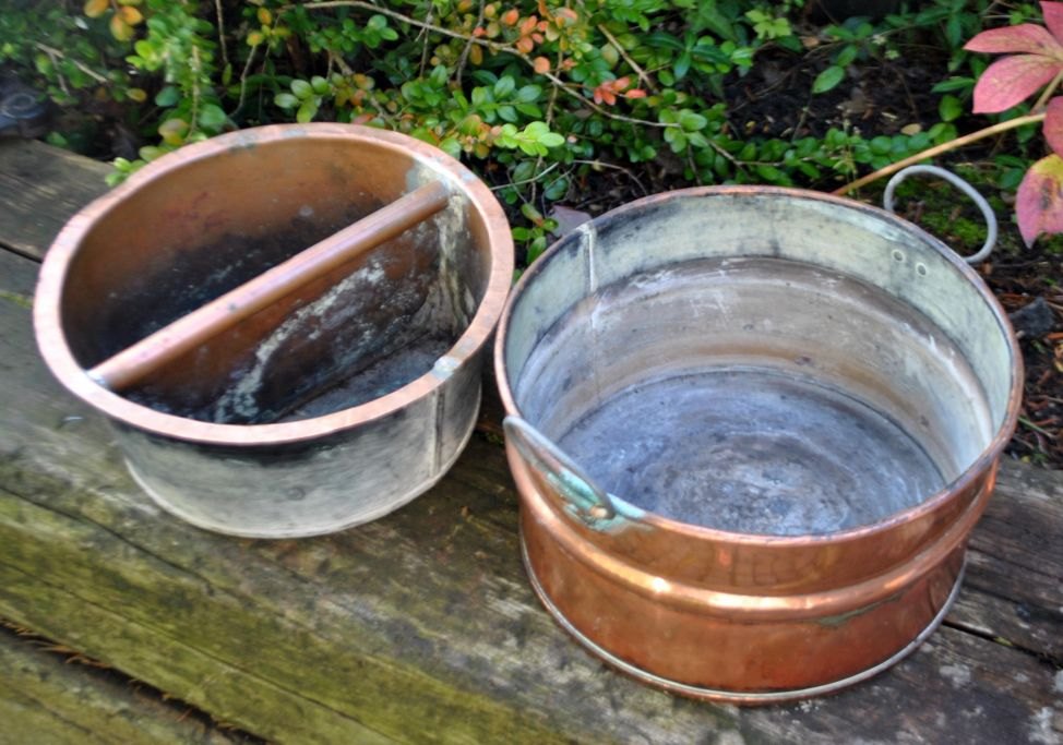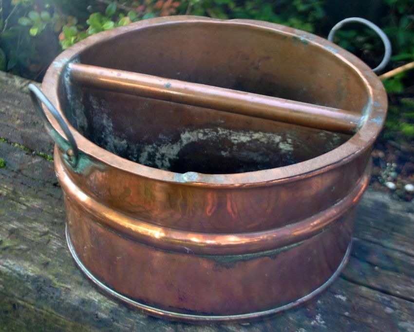 Lim potte i kobber, 19. årh. I to dele. Overdel med to rum. Underdel med to hanke. H: 13,5 cm. Dia: 25 cm.