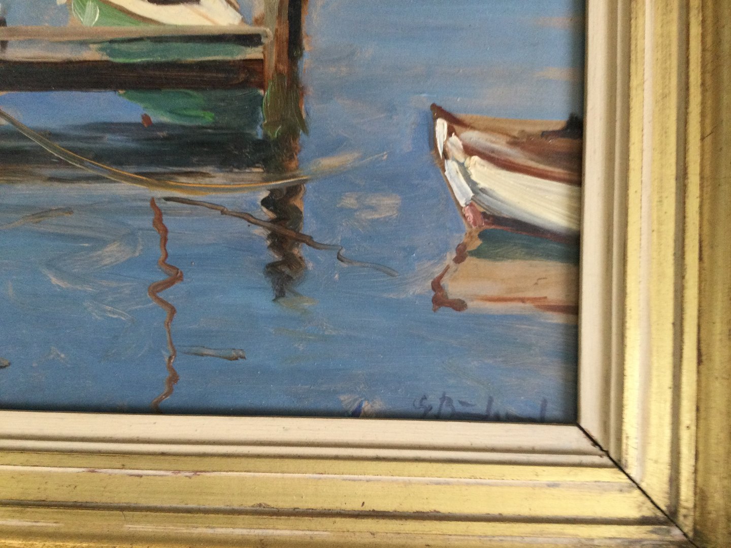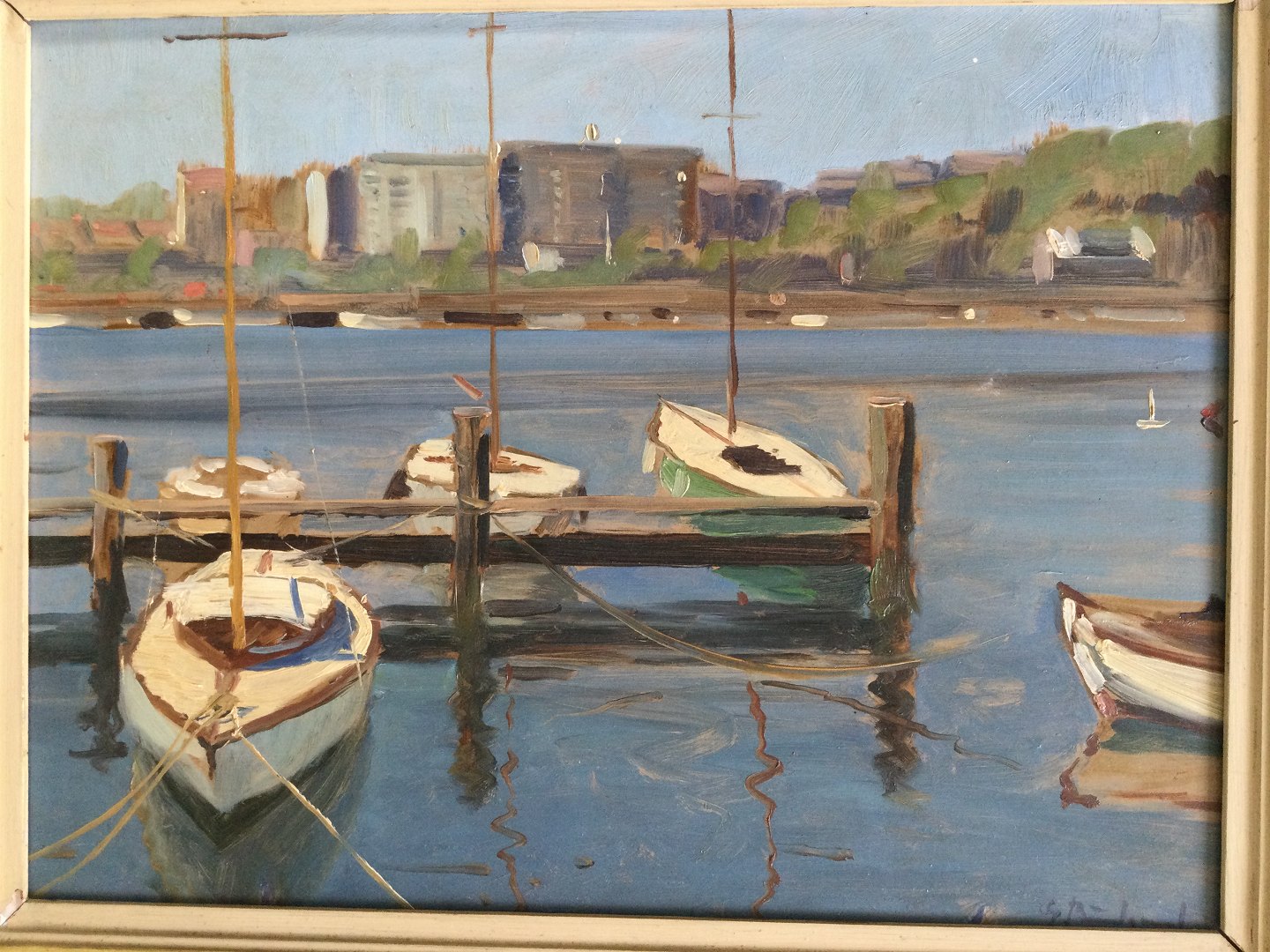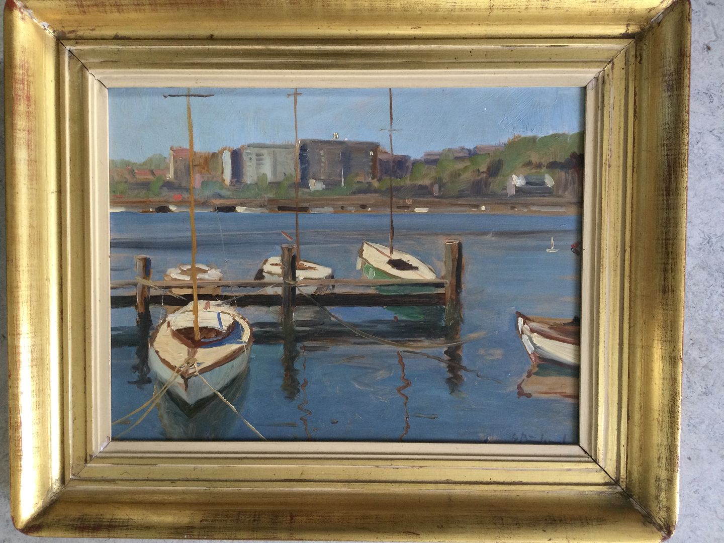 Maleri af Gunner Bundgaard - Havneparti med både.