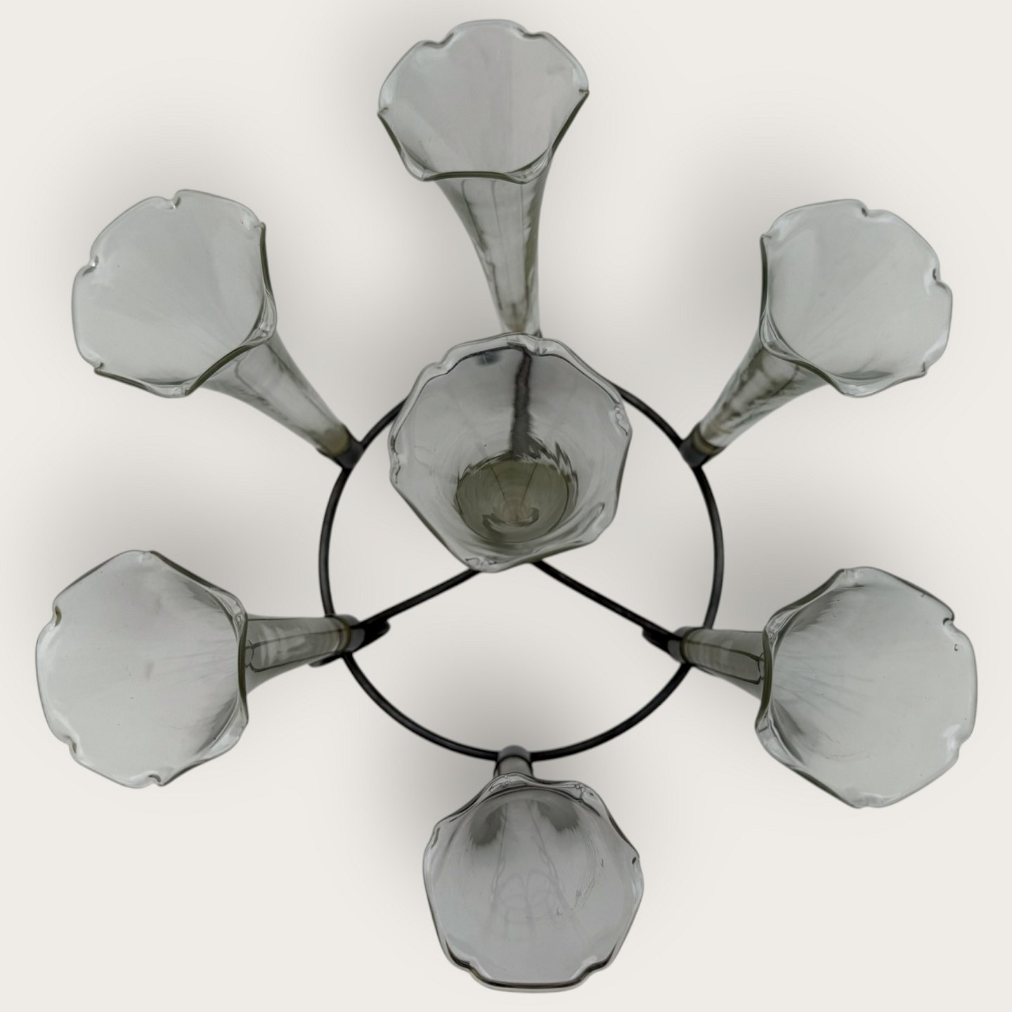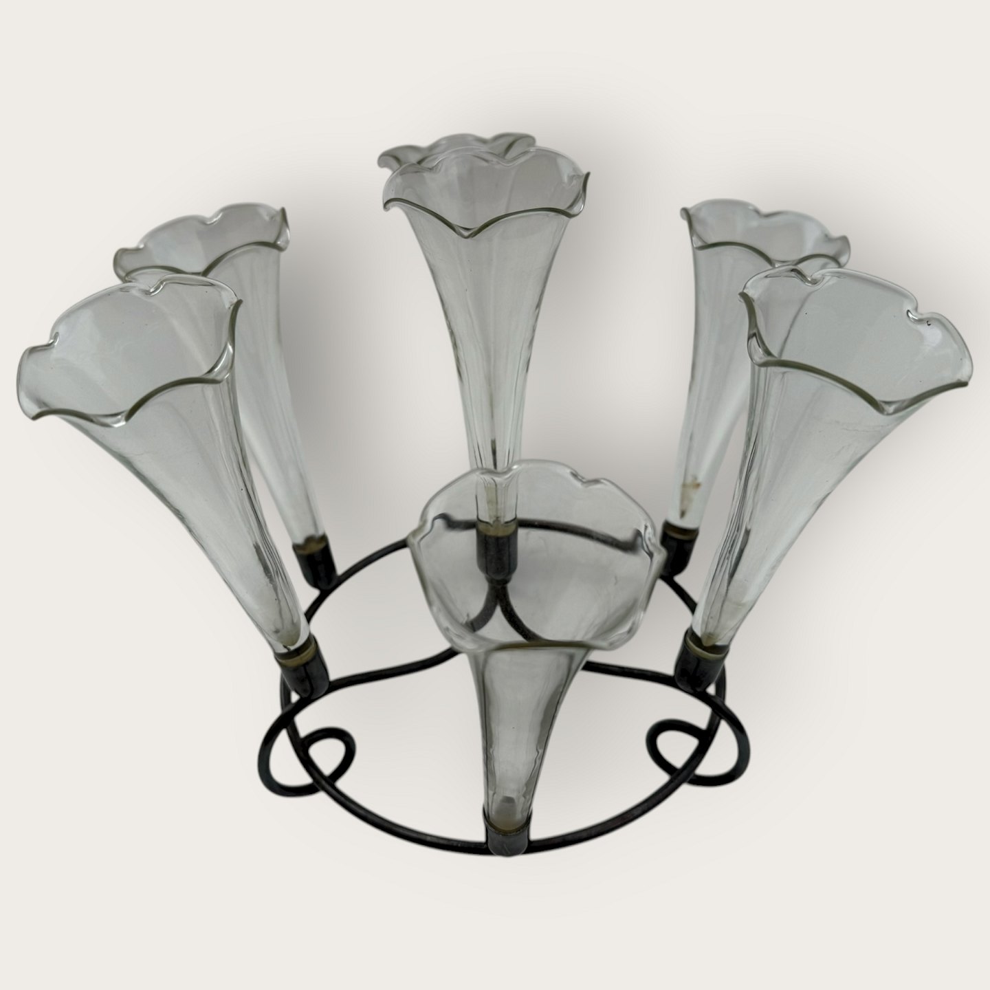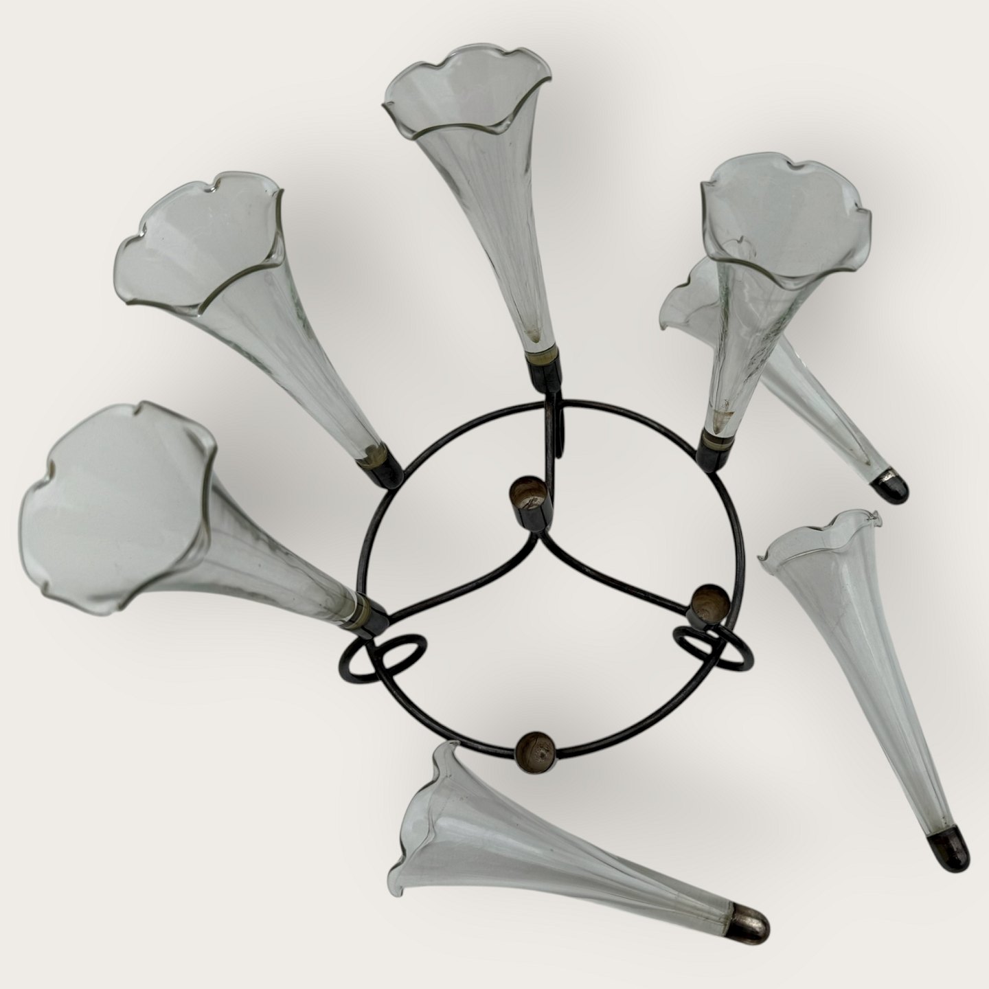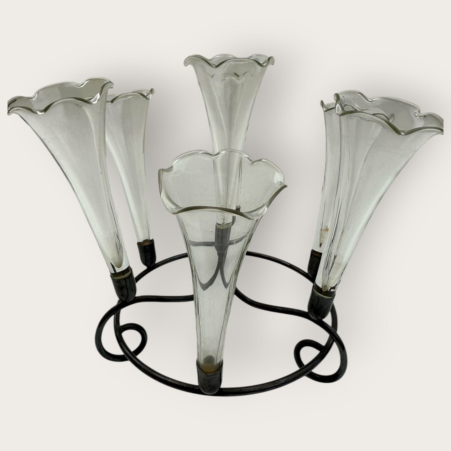 Epergne vase, Fint tyndt glas med flæsekant, alle vaser med sølvpletmontering, 7 vaser i art nouveau holder, ca. 19cm høj og 24cm i diameter, hver glasvase 13x5cm *Fin stand*