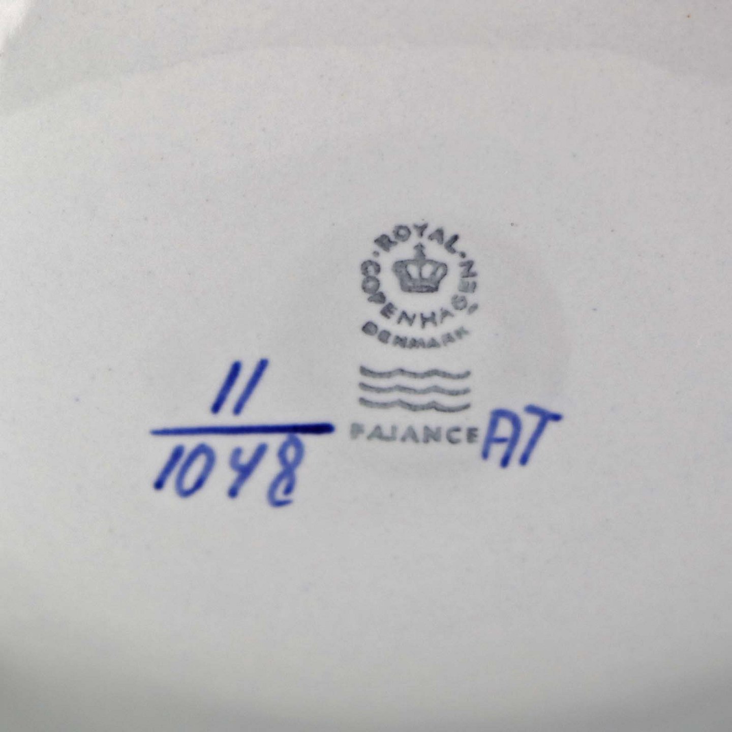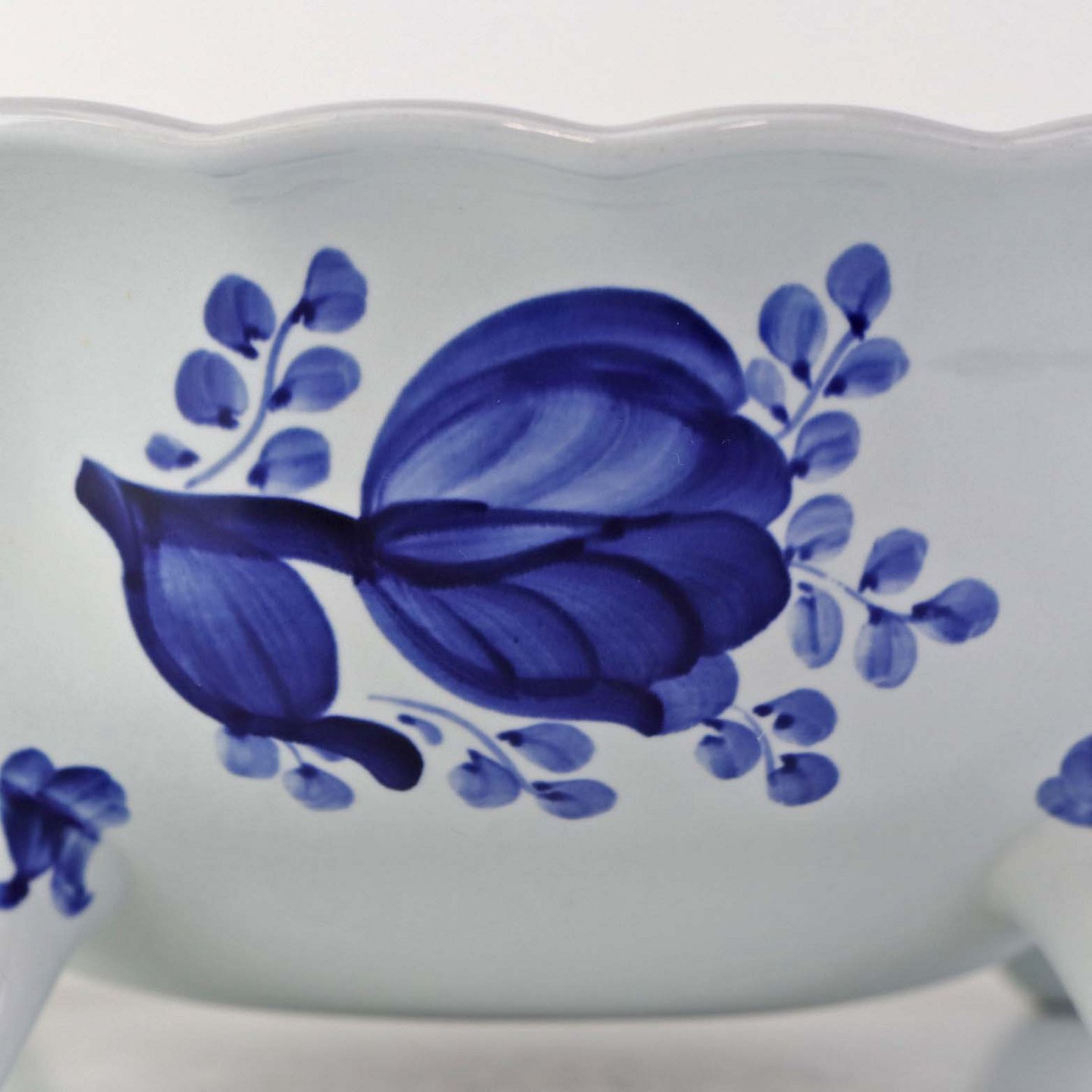 Skål på fire fødder i fajance fra stellet Blå Tranquebar. Nr. 11/1048