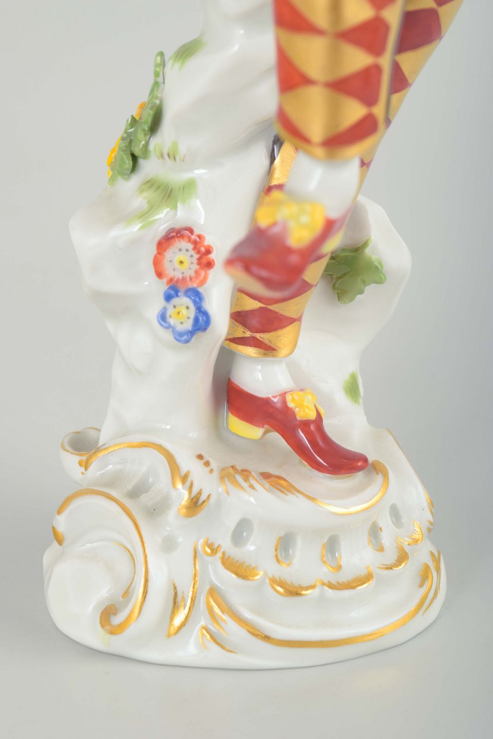 Pragtfuld og detaljerig porcelænsfigur af Harlekin i klassisk Commedia dell’arte-dragt, udført i de fineste farver med overdådig håndmalet staffering i rødt, guld og sort. Figuren skildrer Harlekin i festlig positur med løftet krus, rigt dekoreret med gulddetaljer og stående på en rokoko-inspireret base med blomster.