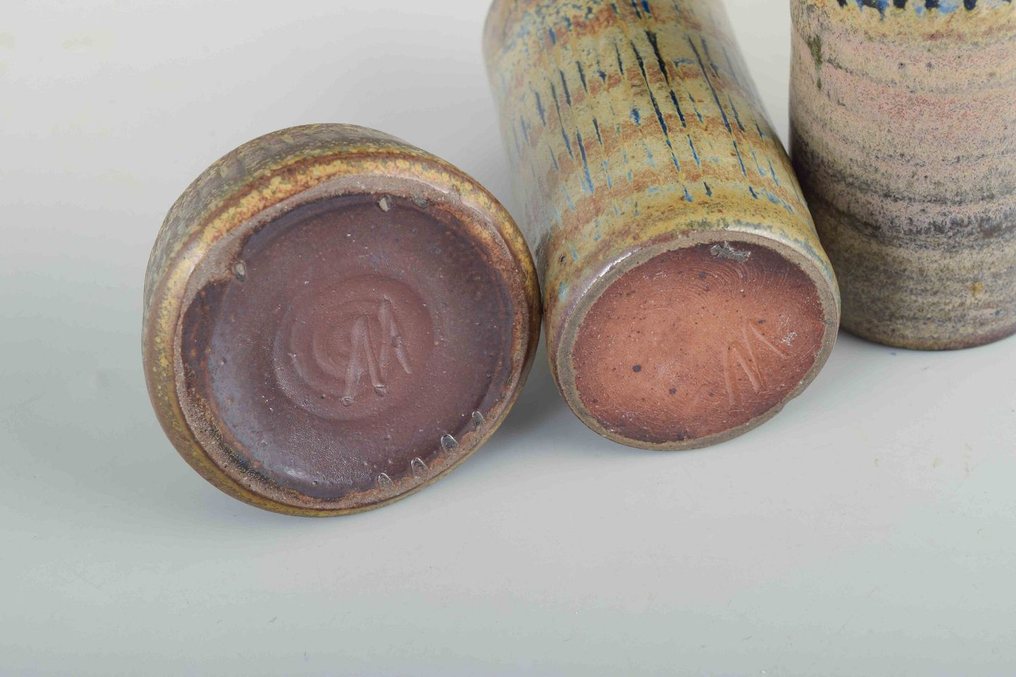 Tre hånddrejede stentøjsvaser – to cylindriske og én lavere, organisk formet. Dekoreret i flerfarvede glasurer i grønne, blå, lilla og jordfarvede nuancer.