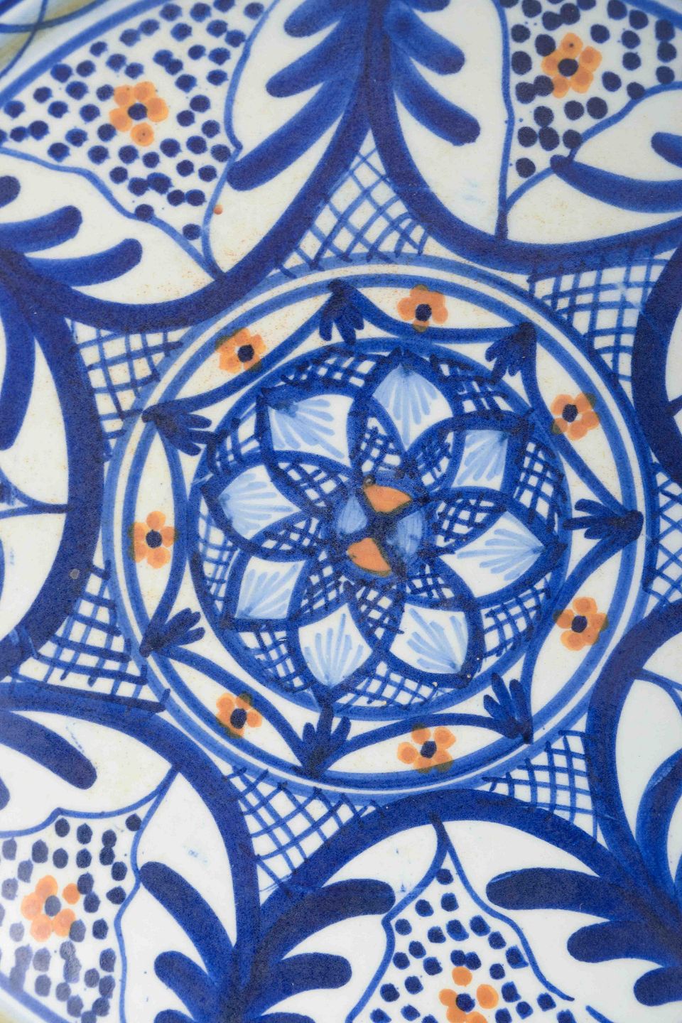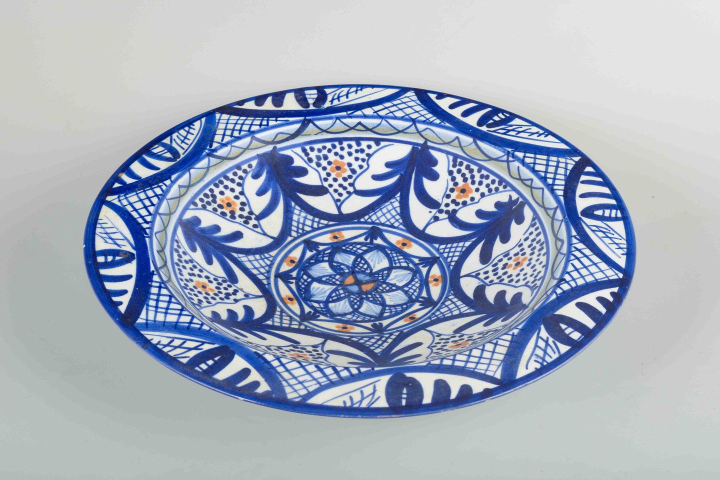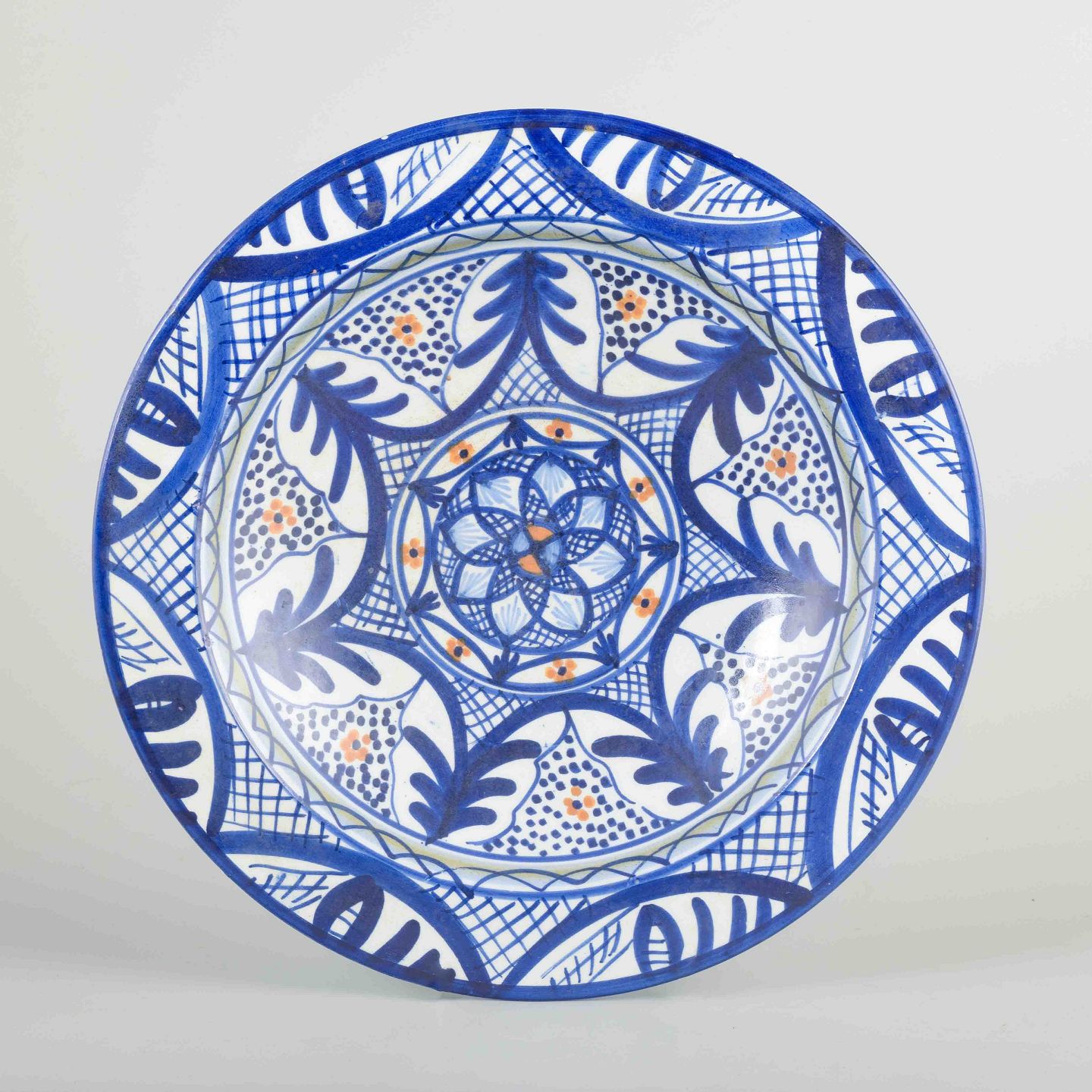 Drejet fajancefad med håndmalet dekoration i blå, orange og hvide toner. Geometrisk og blomstret mønster med klare folkloristiske træk.