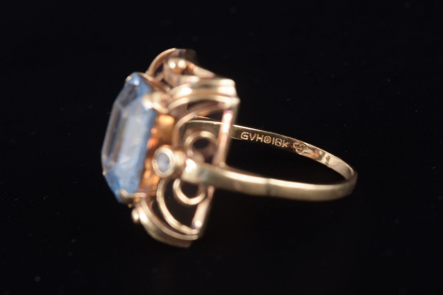 Dekorativ ring i 18 karat guld udført af dansk guldsmed med organisk, skulpturel fatning. Monteret med en lyseblå, firskåret spinel, der giver ringen et elegant og sofistikeret udtryk.