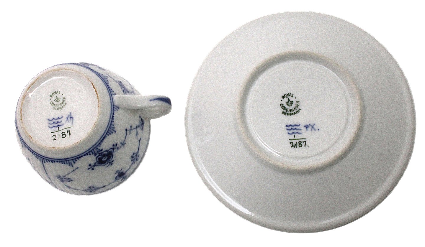 Royal Copenhagen, Musselmalet Riflet. Hotelporcelæn, Jernporcelæn. Robust og kraftigt stel. Stor kaffekop med underkop. Nr. 1/2187. Højde 6 cm. Øverste diameter 9 cm. Underkop diameter 15,5 cm. I. sortering. Pris: 300 kr. stk. Lager: 1