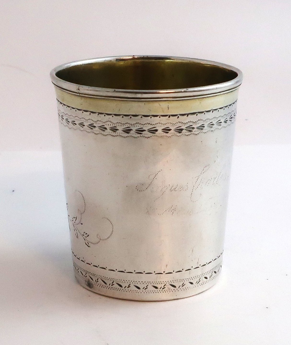 Lorenz Christophersen Linde, født i Bergen. København efter 1786 og død 1809. Sølv bæger med forgyldning. Højde 7,6 cm. Diameter 7 cm.