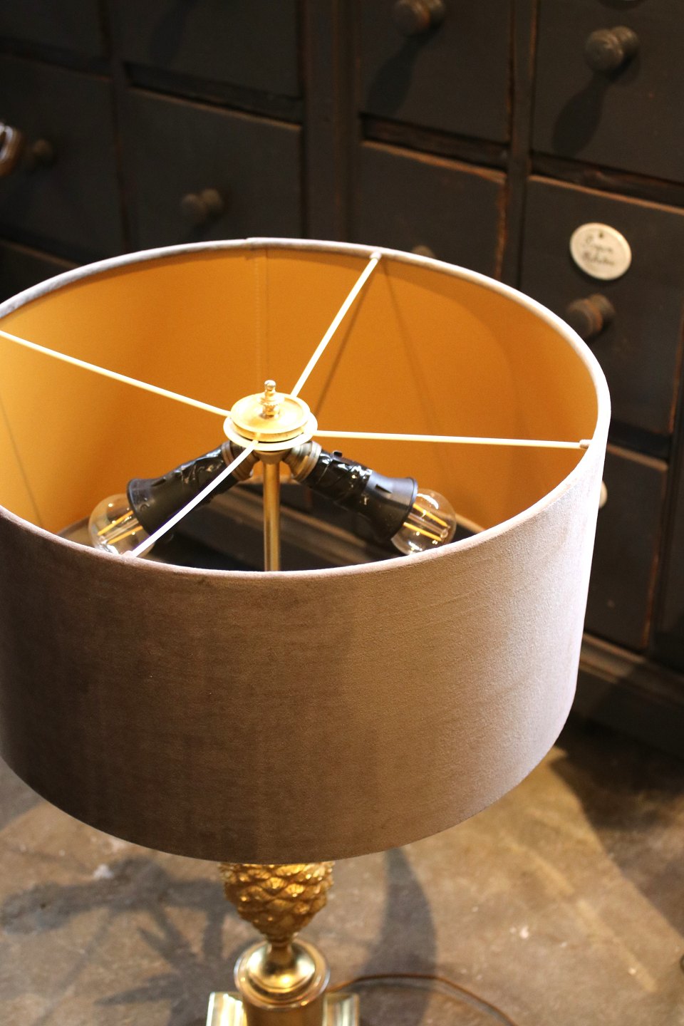 Bordlampen er monteret med velour lampeskærm i flot varm grå farve med guld på indersiden af skærmen.