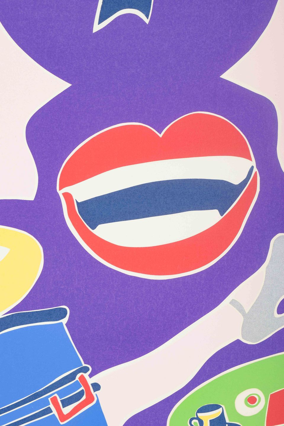 Kompositorisk og fabulerende motiv med surrealistiske figurer, hænder, mund og stiliserede hoveder i stærke kontrastfarver. Værket udstråler Krøjers karakteristiske leg med popkunst, humor og visuel poesi, hvor flader og figurer brydes op i en livfuld, fortællende helhed.