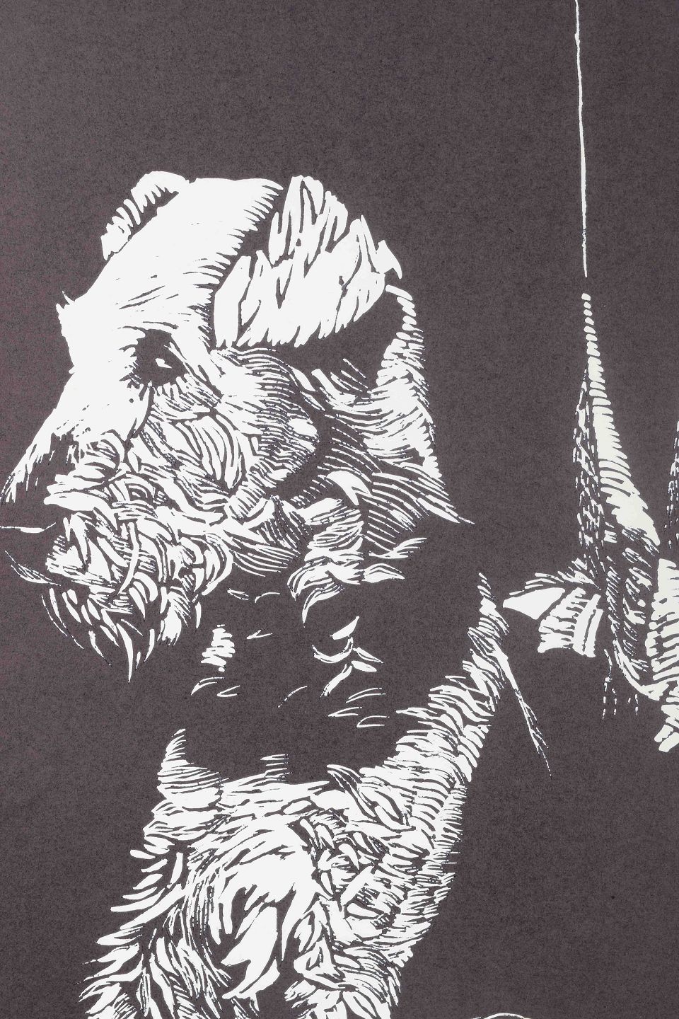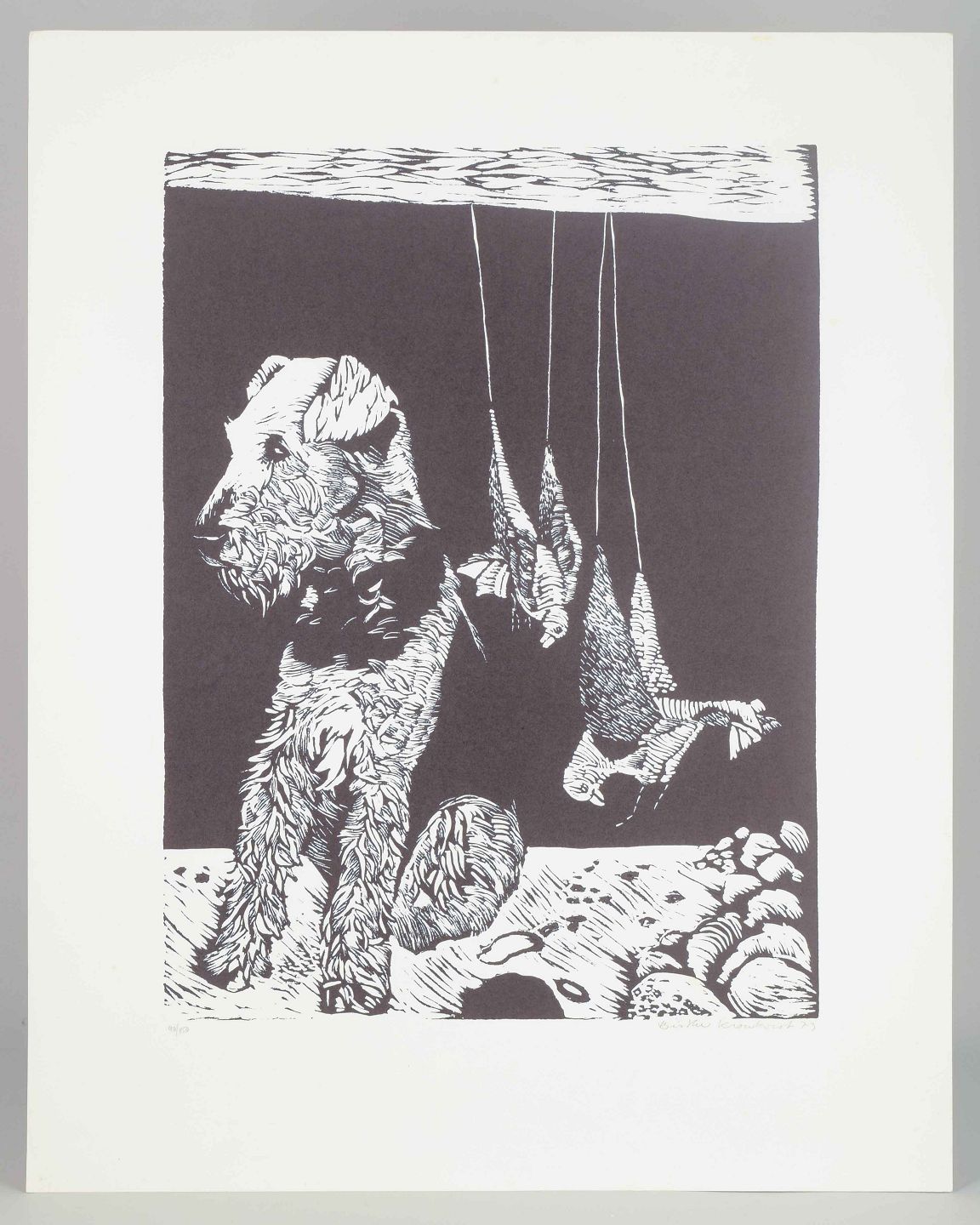Sort-hvidt farvelitografi med motiv af en terrier-lignende hund, der sidder ved siden af ophængt jagtvildt. Motivet kombinerer naturalistiske detaljer med grafisk kontrast i en enkel, stiliseret komposition.