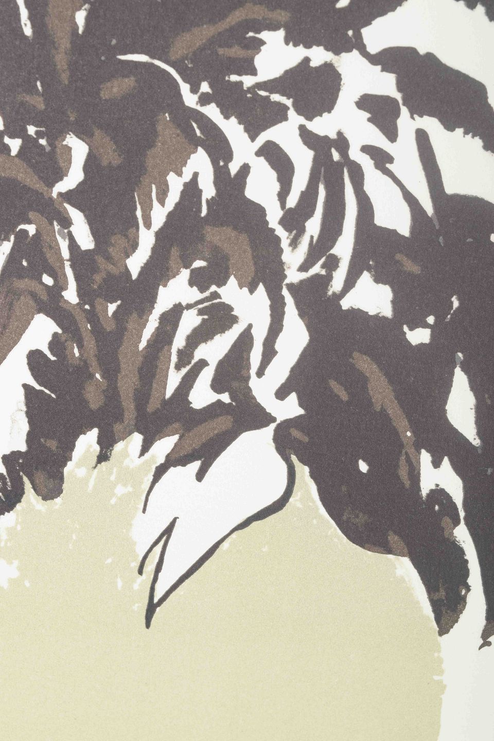 Motiv med stiliseret plante i rund vase, udført i dæmpede jordfarver og kontrasterende flader. Et dekorativt og harmonisk værk, hvor den grafiske bearbejdning af bladene skaber et levende spil mellem lys og skygge.