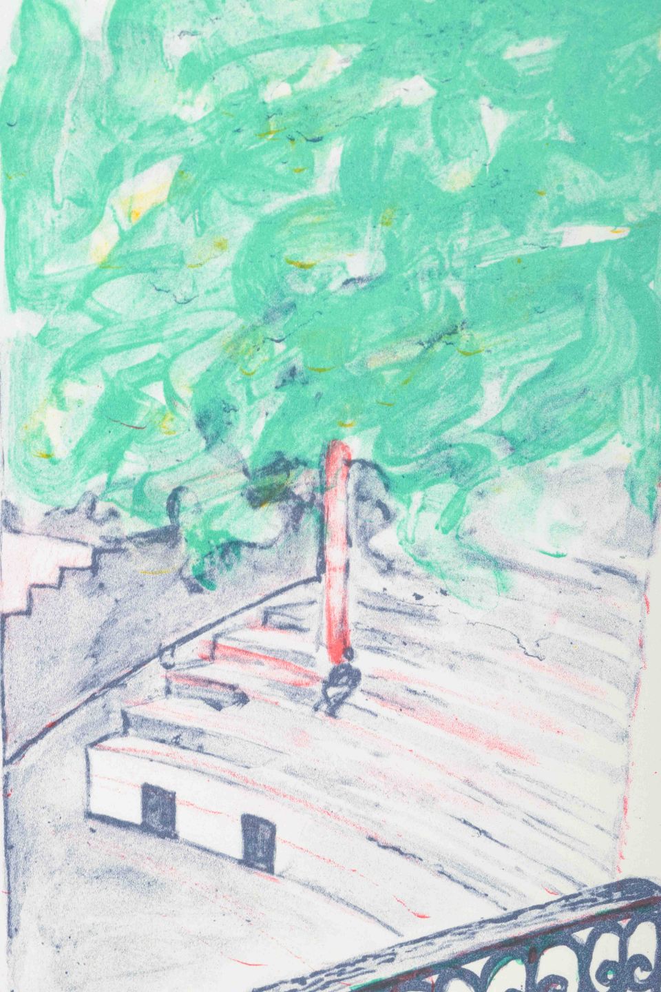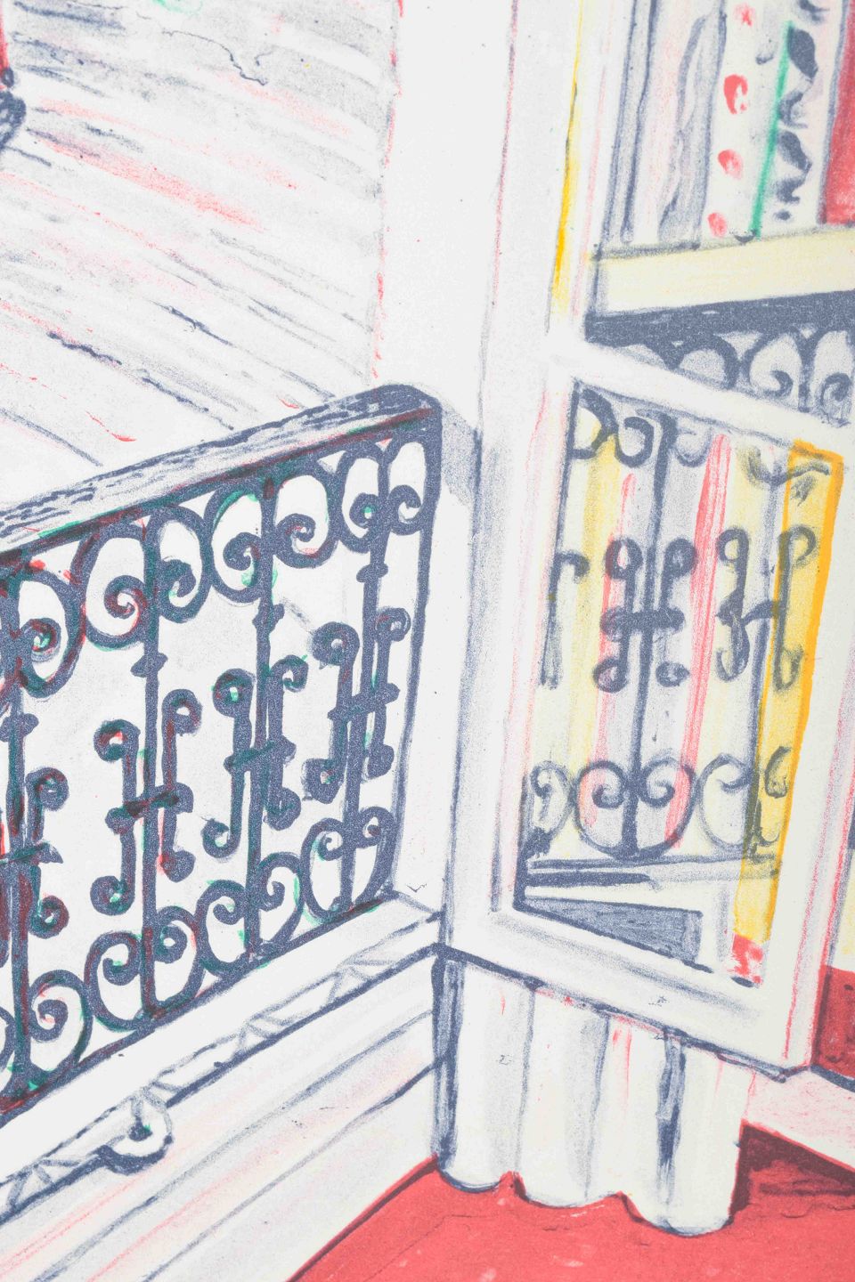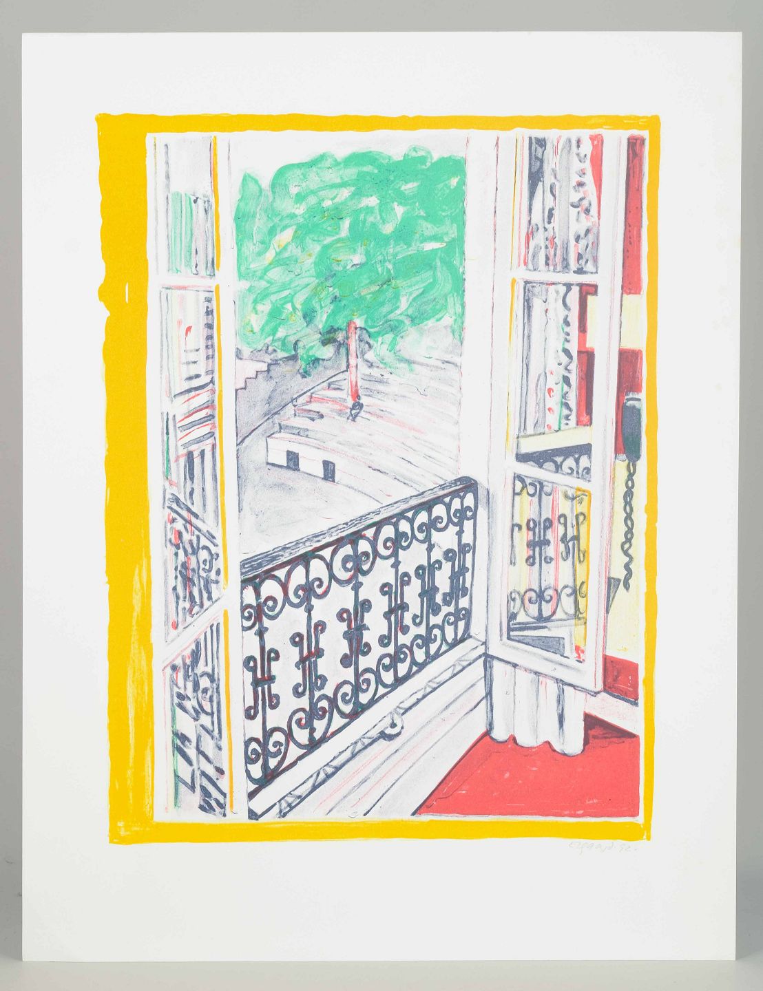Et farverigt og detaljeret værk, der skildrer et kig ud gennem en fransk altandør med smedejernsgelænder, hvor lys og rum åbner sig mod en grøn trækrone og en stille gade. Kompositionen balancerer mellem det intime interiør og det urbane uderum, hvilket skaber en poetisk oplevelse af nærvær og afstand.