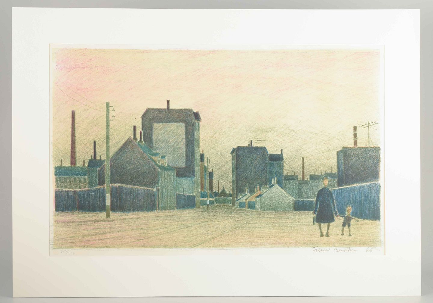 Et karakteristisk motiv fra arbejderkvarteret, hvor den åbne plads omkranses af fabriksbygninger, skorstene og elmaster. I forgrunden ses en kvinde med et barn, som fremhæver menneskets tilstedeværelse midt i de strenge, arkitektoniske rammer. Værket viser Bendtsens sans for at indfange både hverdagslivet og de urbane omgivelser i et poetisk lys.