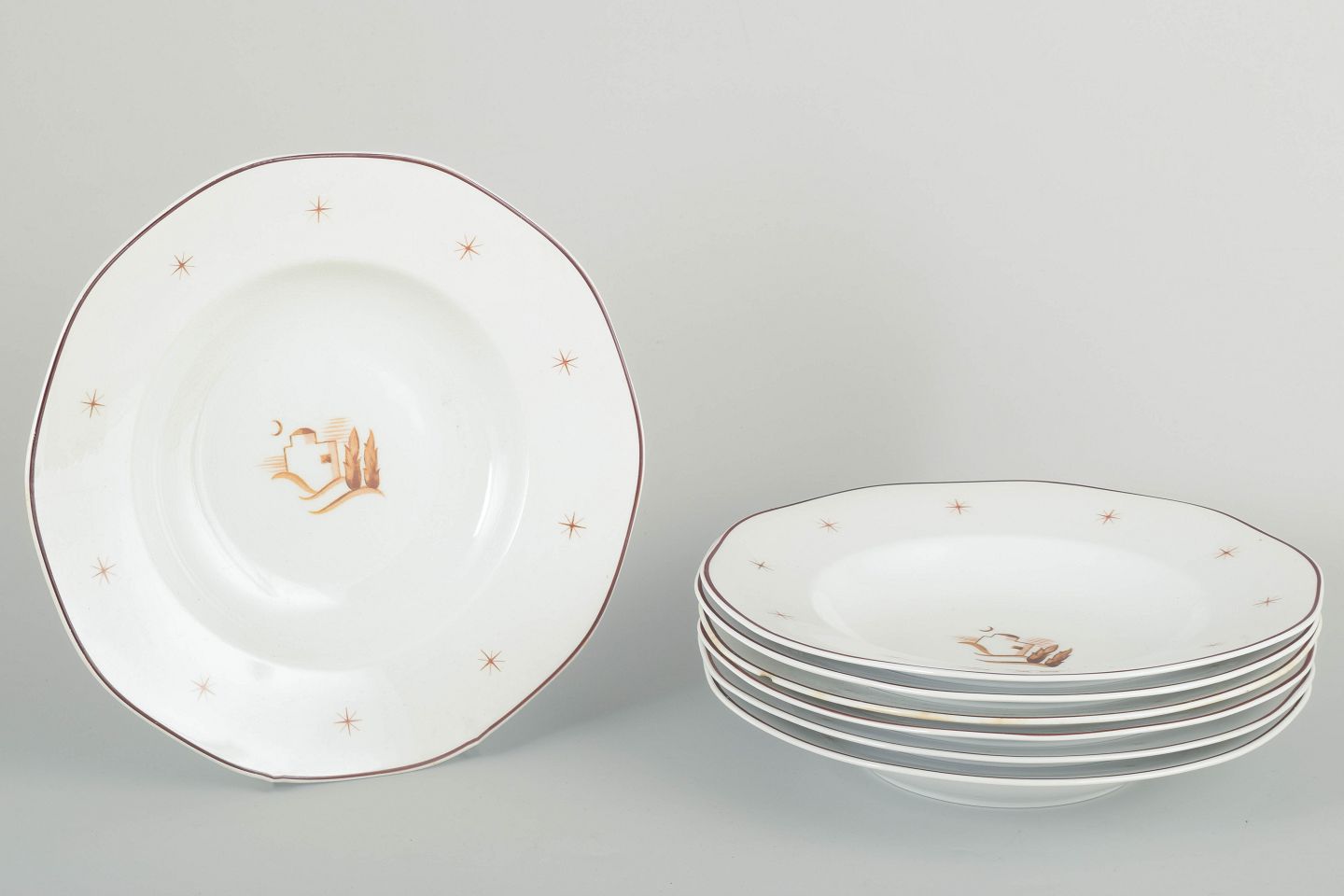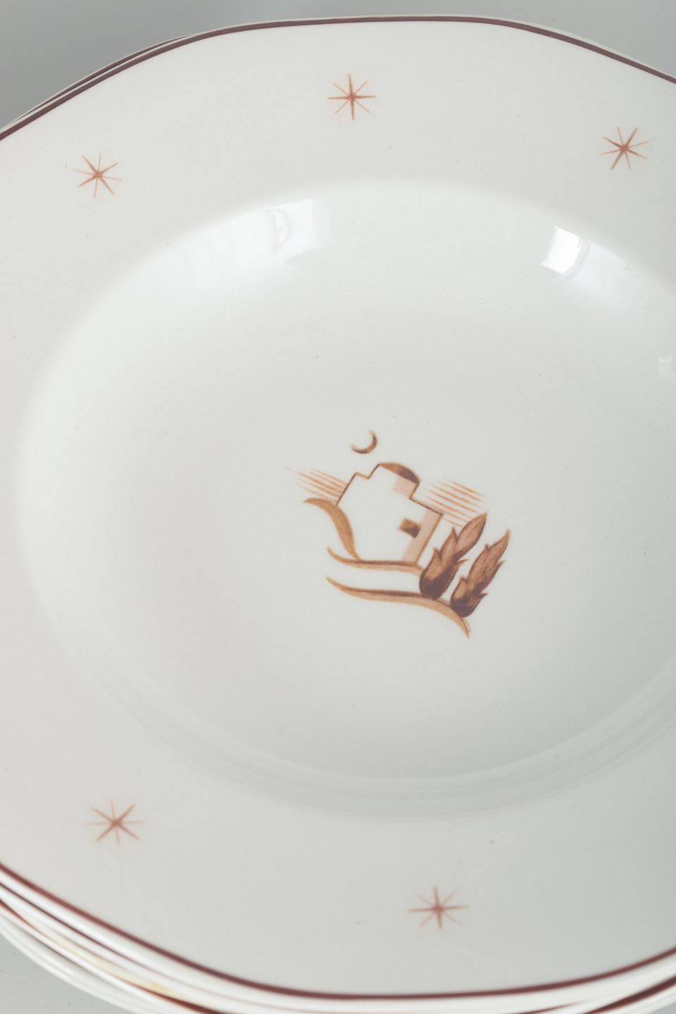 Art Deco-inspirerede suppetallerkener i hvidt porcelæn med dekoration i brune og gyldne toner, stjerneornamenter langs randen samt motiv af et hus og træer.