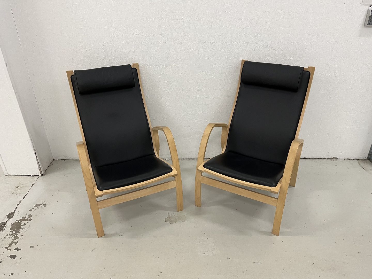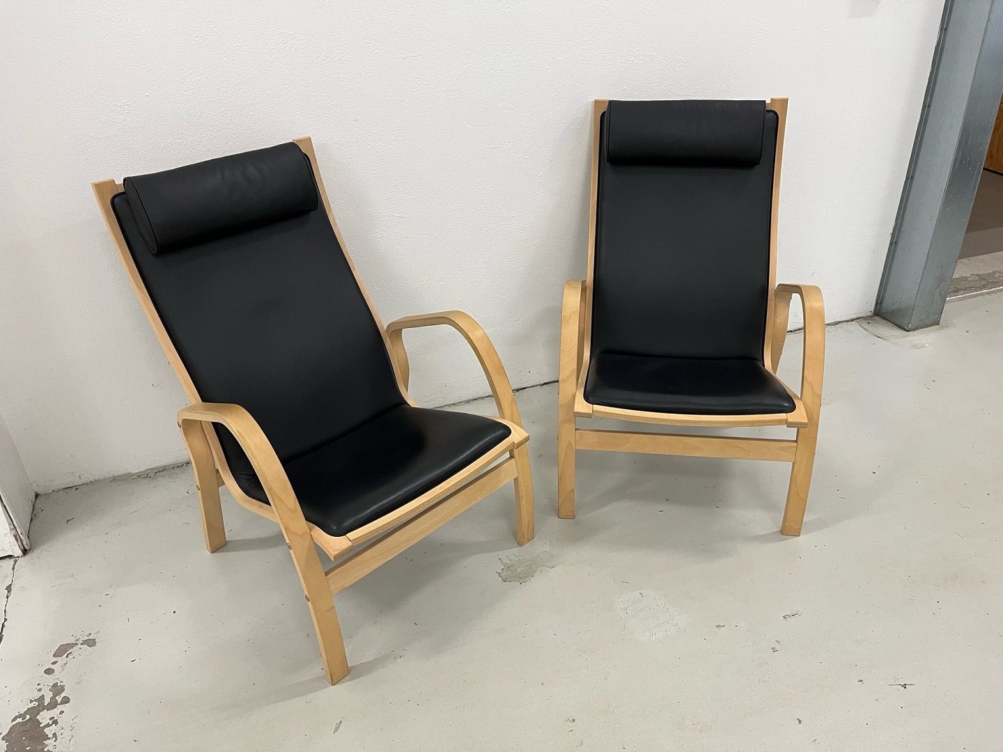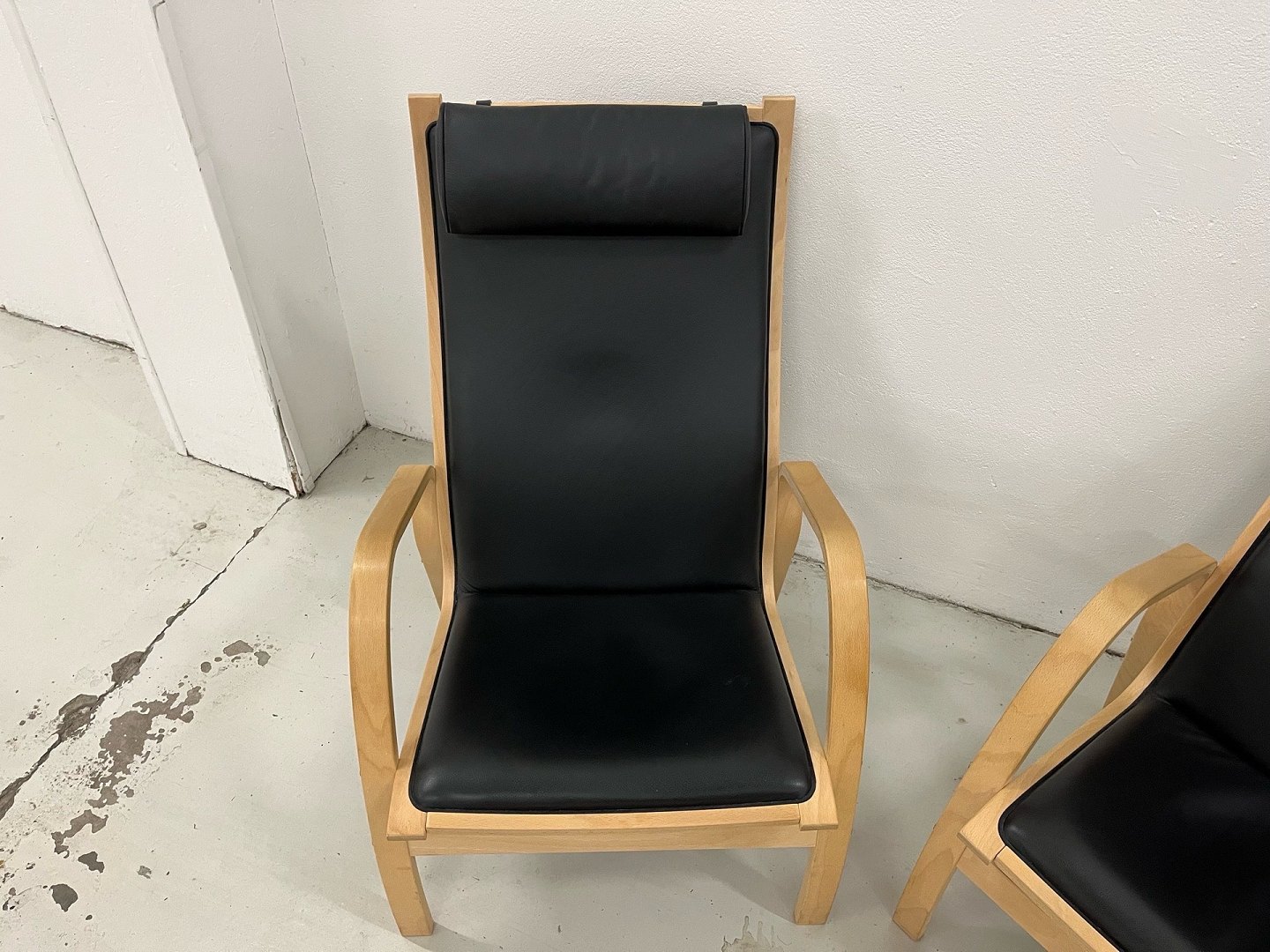 Fin Østergaard stole i sort hanskeblød læder og med stel i sæbebehandlet bøg.