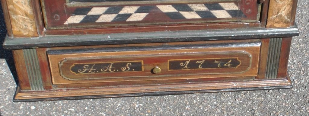 Dansk Louis XVI bemalet hængeskab, 1774. Med tandsnit for oven og søjler i siderne. Med en skuffe. Bemalet med skak tern og blomsterranke i midten på lågen. Indvendig med en hylde - grønmalet. Med initialerne: HAS og 1774 på skuffens forside. H.: 75 cm. B.: 70 cm. D.: 30 cm.