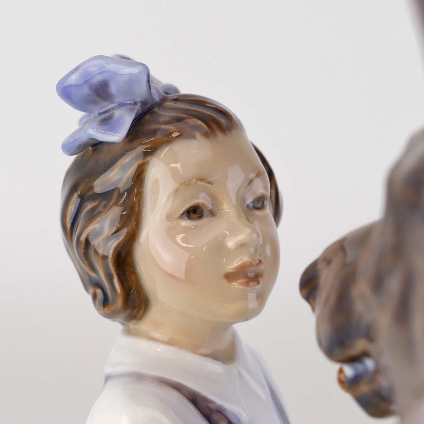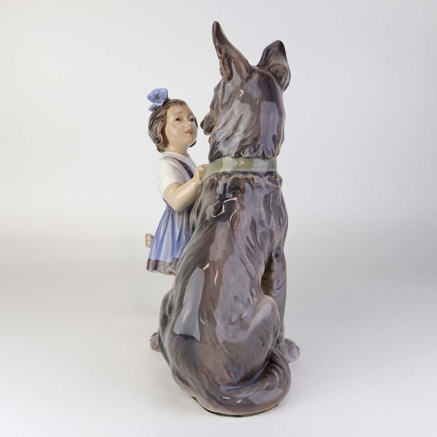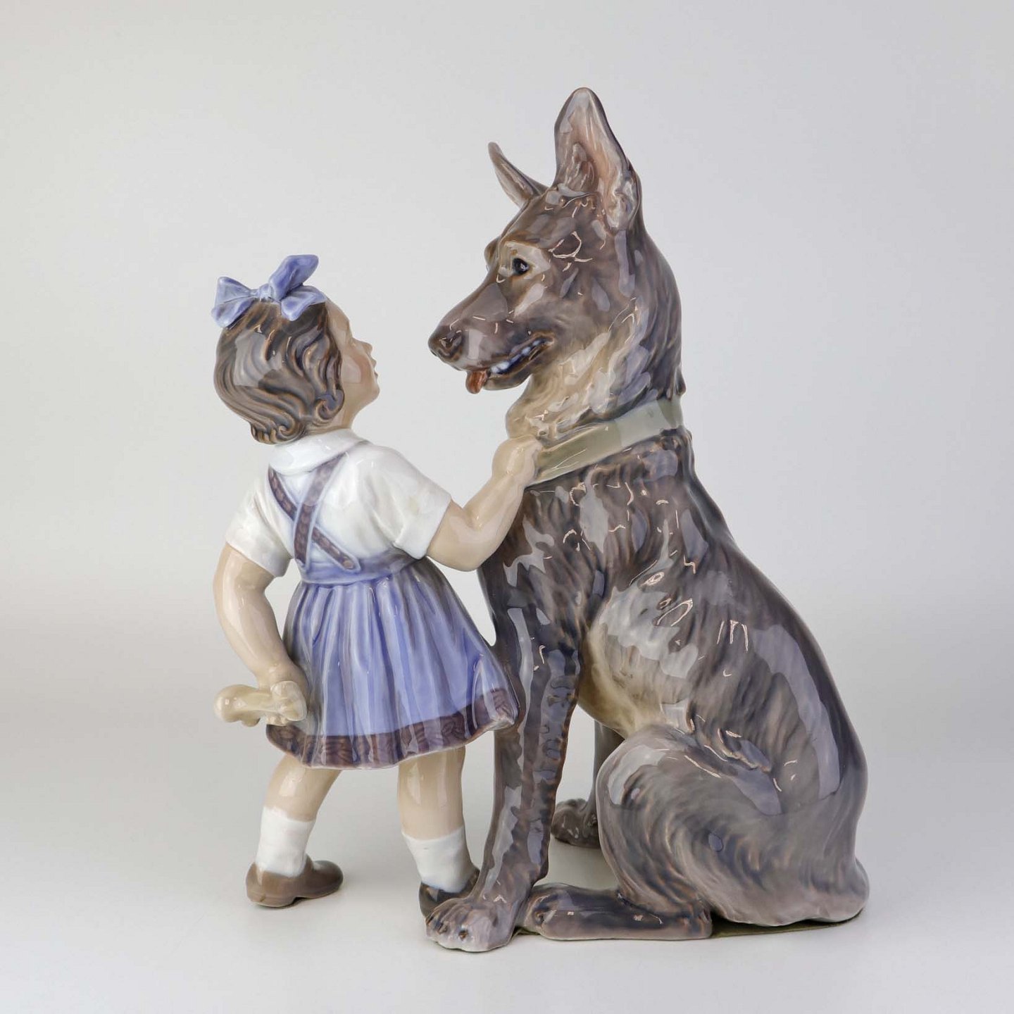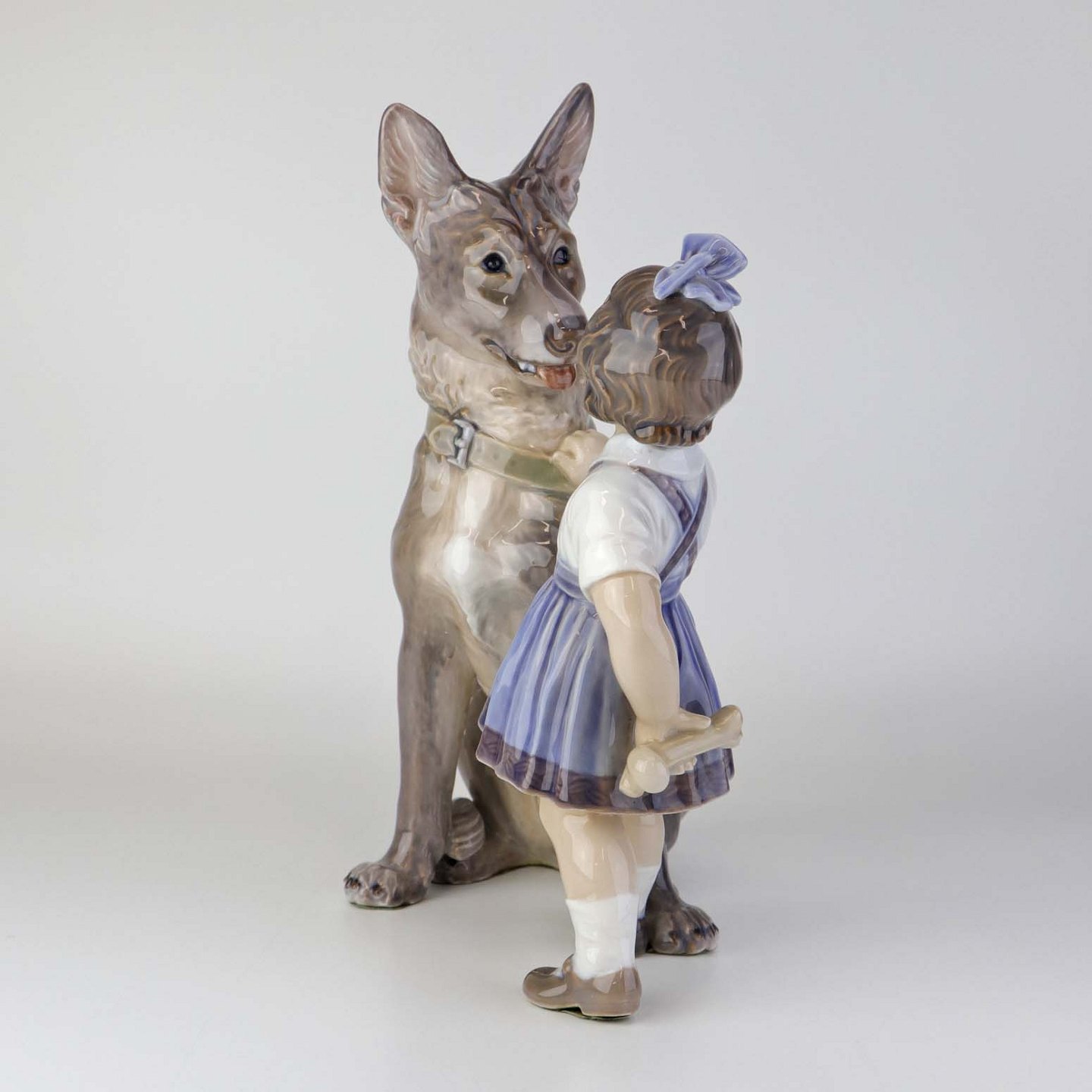Figur i porcelæn med motiv af pige, som gemmer et købben bag ryggen med siddende schæferhund. Nr. 1213