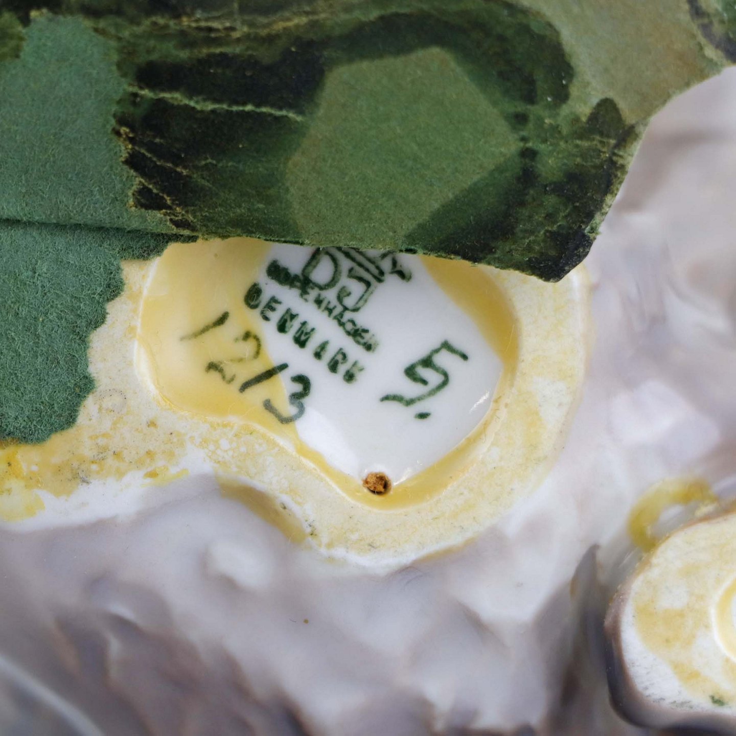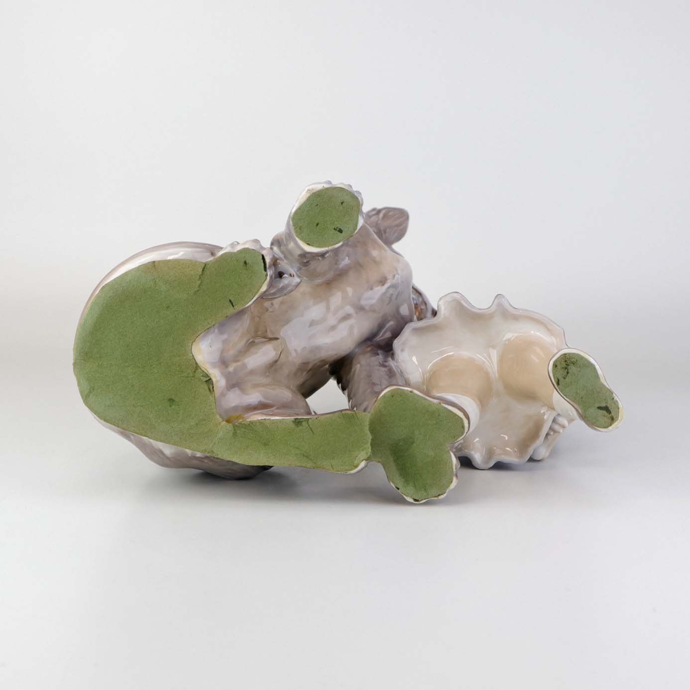 Figuren er beklædt med grønt pap under bunden og limrester kan ses under bunden ved papirets hæftning.