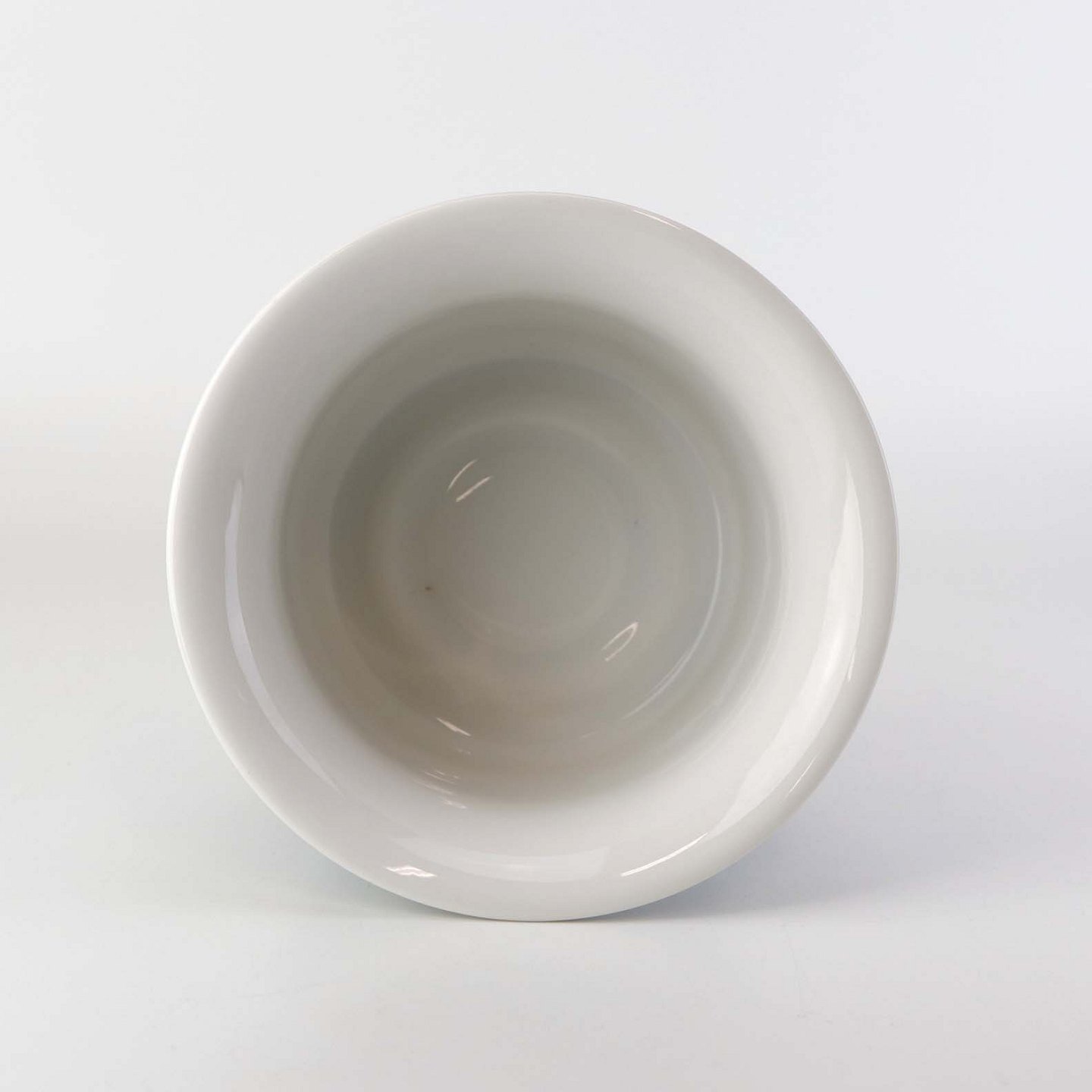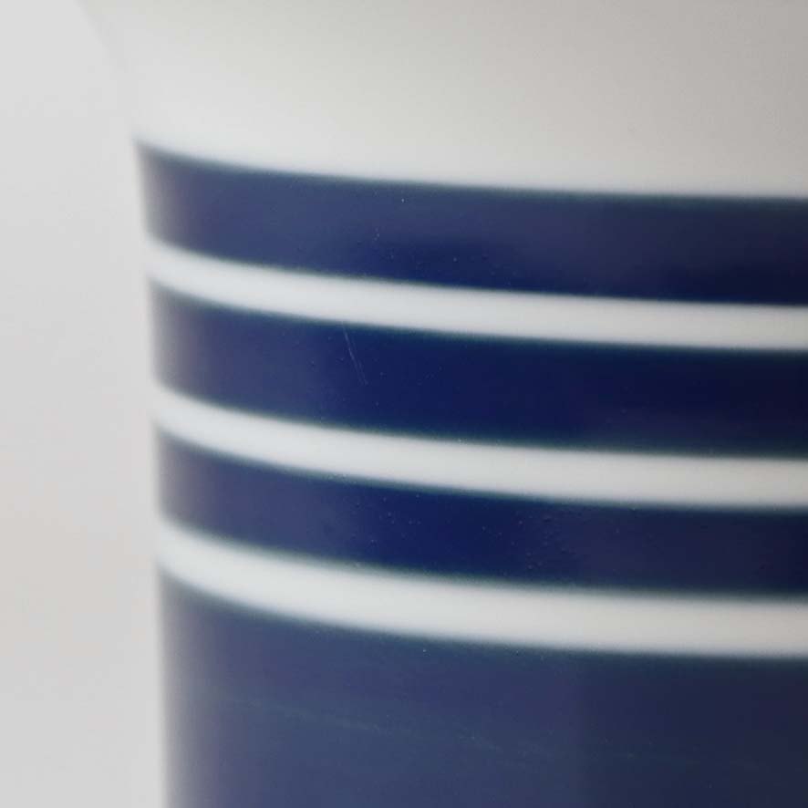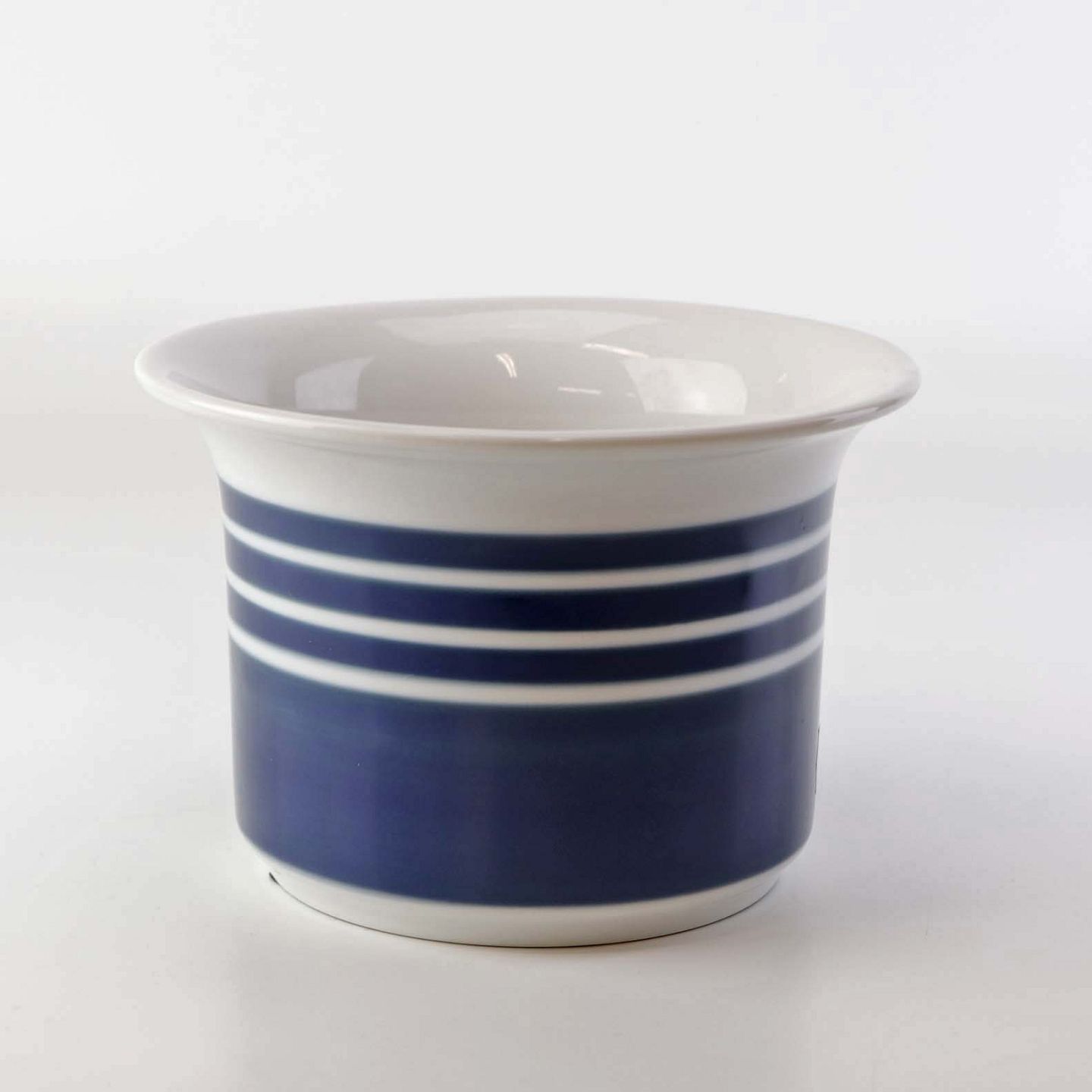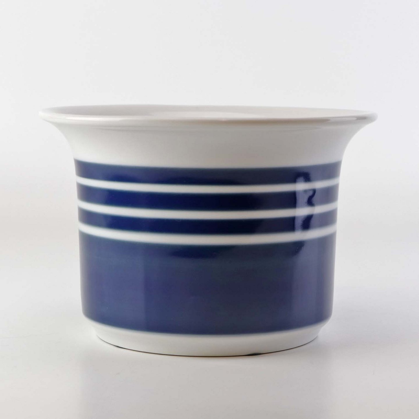 Mellemstørrelse urtepotteskjuler i glat hvidt porcelæn dekoreret med blå striber. Nr. 1855/6103