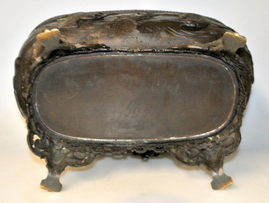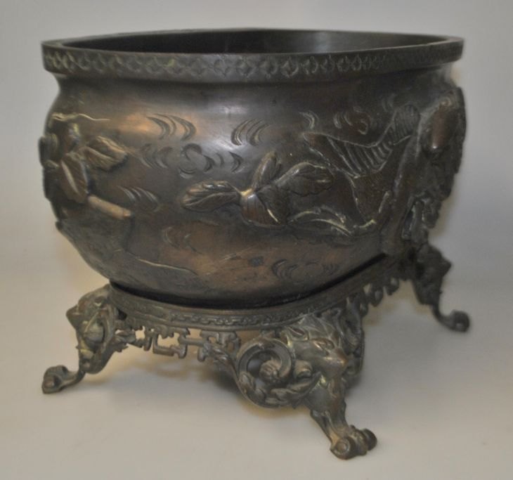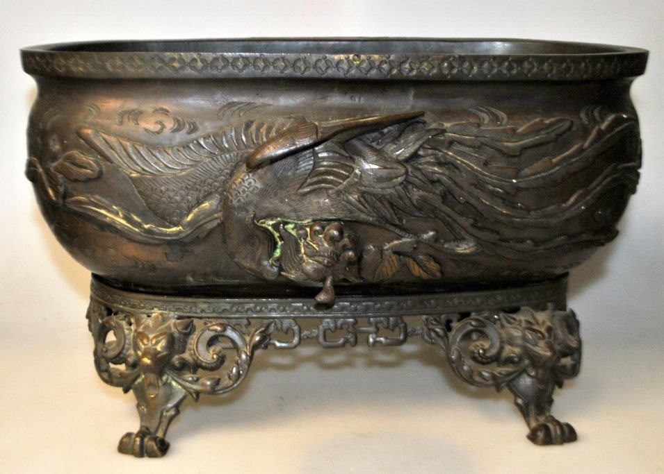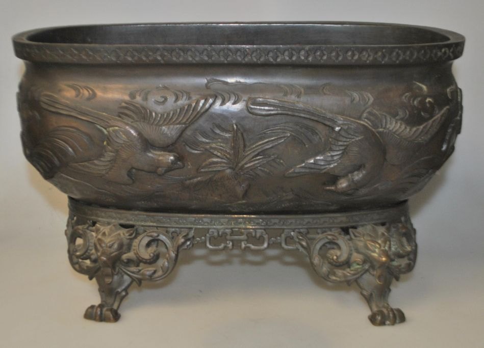 Stor kinesisk bronze blomster jardiniere, 19. årh. På fire løvefødder. Med kantdekorationer. Sider dekoreret med stor drage og fugle. L.: 32 cm. B.: 19 cm. H: 18 cm.