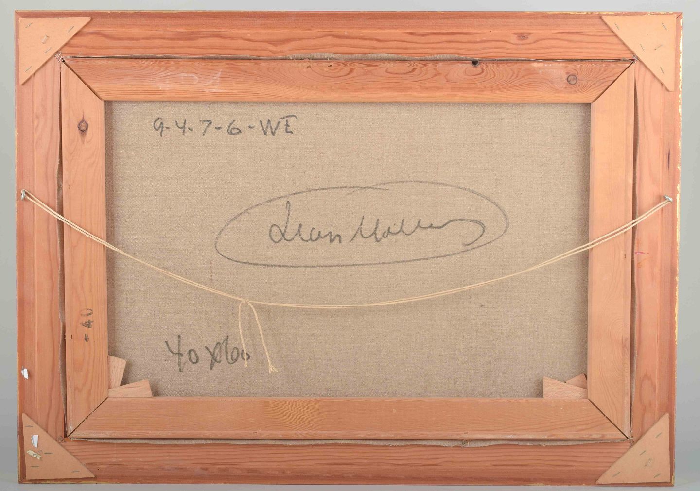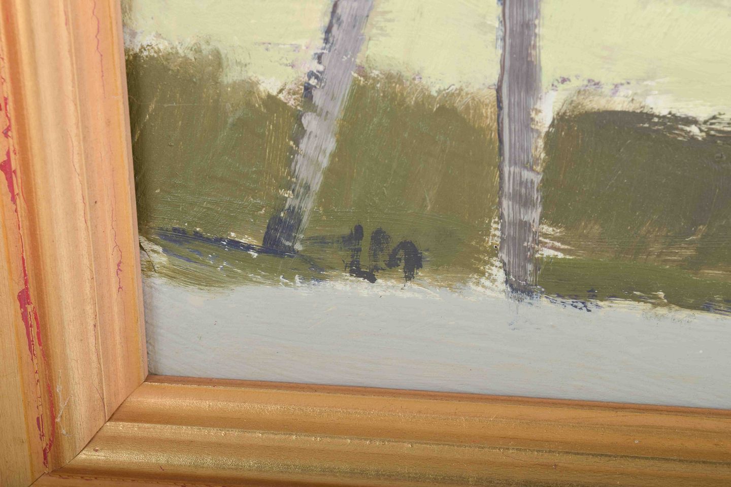 Et stemningsfuldt landskab med huse, udført i afdæmpede jordfarver og grønne nuancer, hvor arkitektur og natur smelter sammen i en rolig komposition.