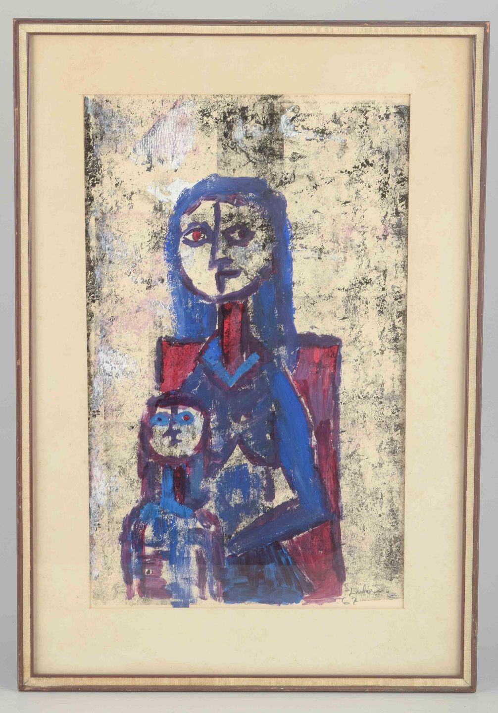 Et ekspressivt figurativt værk i stærke blå og røde toner, hvor moderfiguren og barnet fremstilles med markante konturer og et råt, næsten ikonisk formsprog. Maleriet bærer præg af 1960’ernes eksperimenterende tilgang til farve og figur og udstråler både intensitet og nærhed.