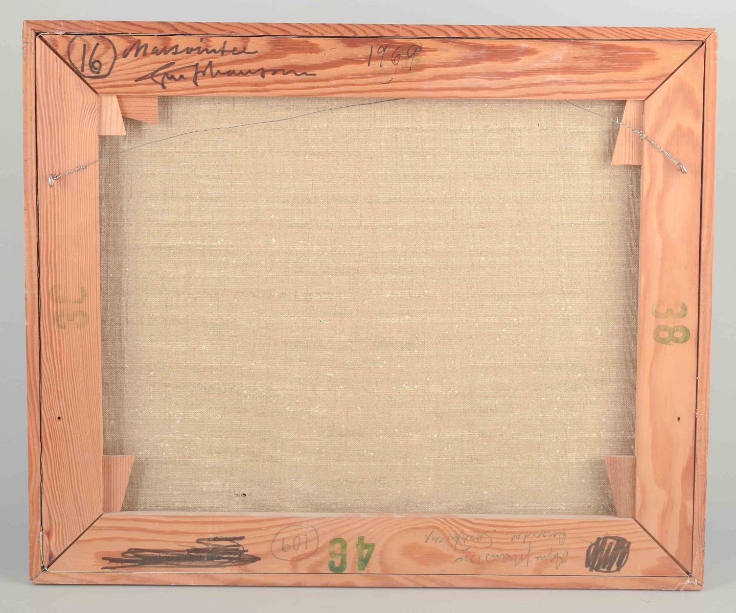 Et modernistisk landskabsmaleri med vinterscene, der skildrer sneklædte marker og en kold himmel i en struktureret og farverig komposition. Værket afspejler Johanssons følsomhed for farve og form i en nordisk kontekst.