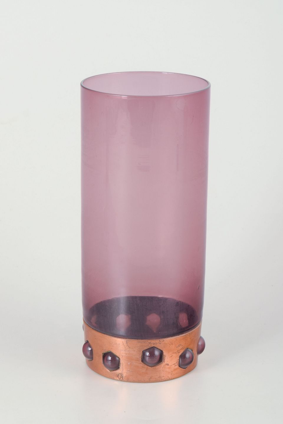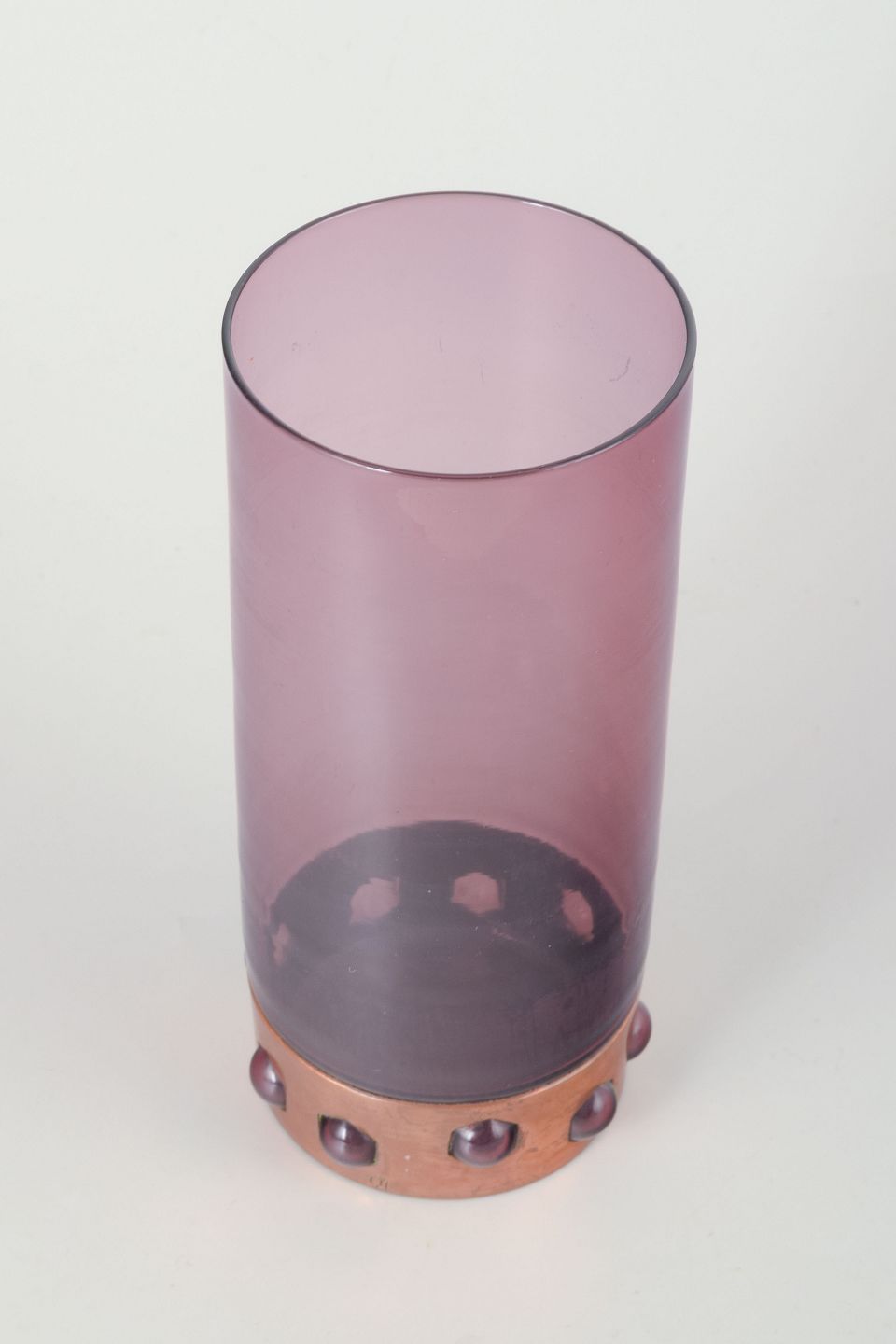 En cylinderformet vase i violet glas monteret i en hamret kobberfod dekoreret med indlagte glasprikker i matchende farve. Designet af Nanny Still for Raak. Kombinationen af farvet glas og metal giver et markant og skulpturelt udtryk, typisk for Stills arbejde med kontraster og materialespil.