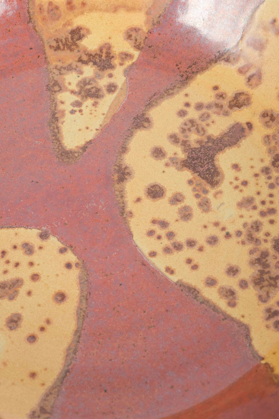 Drejet stentøjsskål med rødbrun bundglasur og dekoration i gule, plettede felter i et organisk, abstrakt mønster.