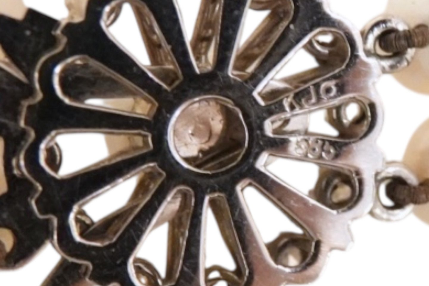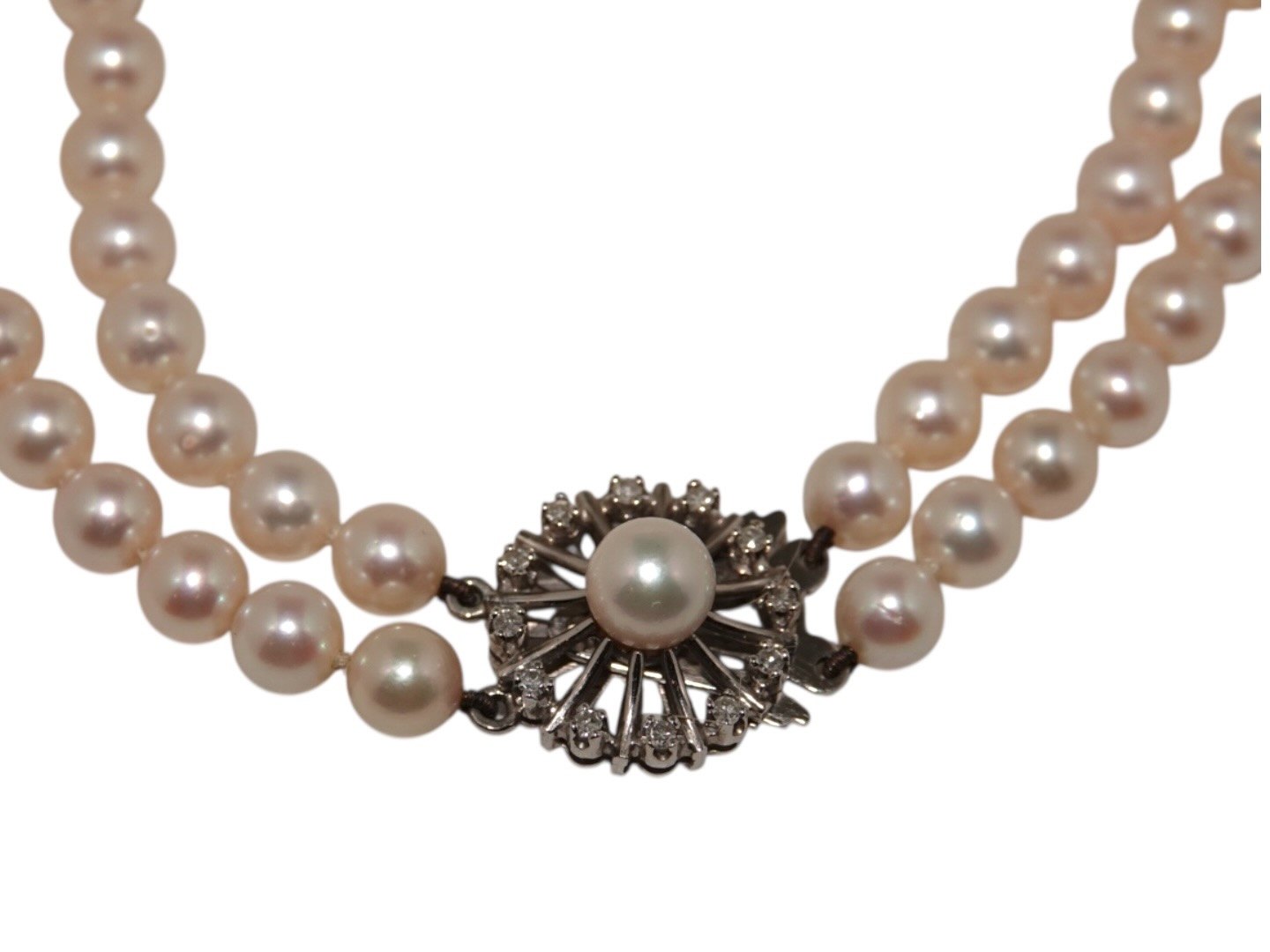 Dobbeltradet perlekæde af store japanske rosa Akoja perler med 14 karat hvidgulds vedhæng med diamanter