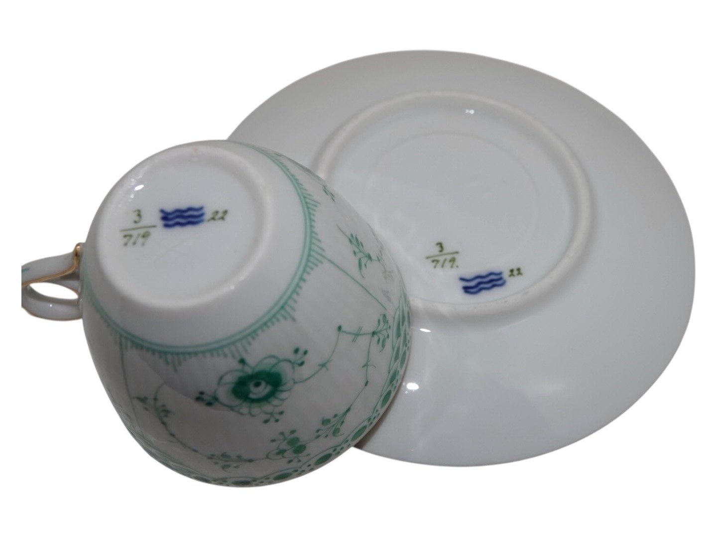 Royal Copenhagen Grøn Musselmalet Halvblonde med guldkant, lille kaffekop med tilhørende underkop.